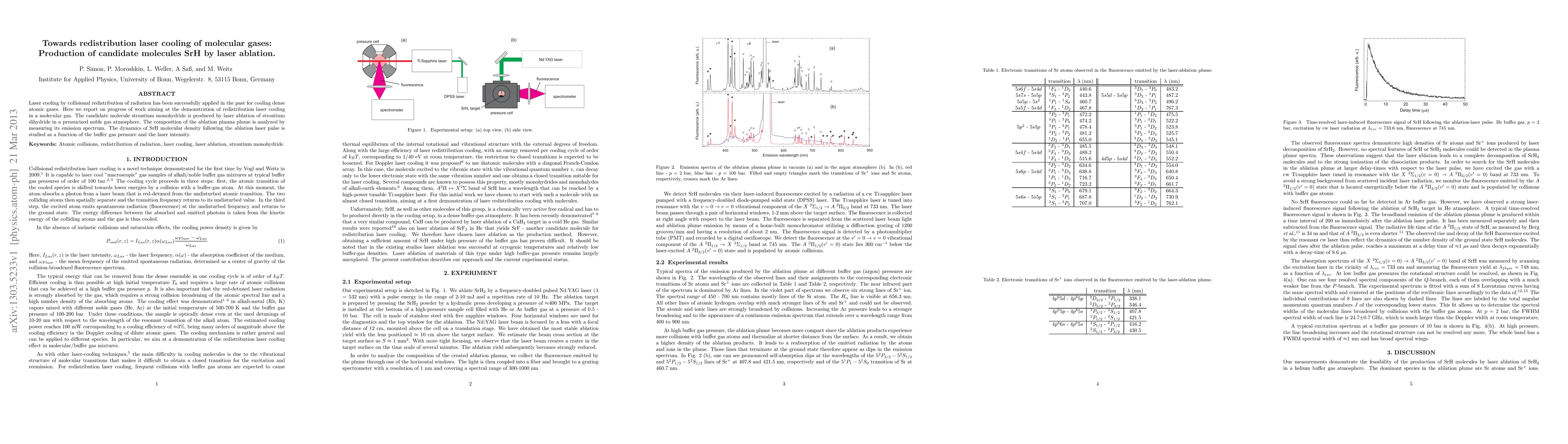 This paper reports progress toward demonstrating redistribution laser cooling in molecular gases, specifically focusing on producing strontium monohydride (SrH) via laser ablation of strontium dihydride in a noble gas atmosphere. The study analyzes the ablation plasma plume's emission spectrum and examines the dynamics of SrH molecular density under varying buffer gas pressures and laser intensities.