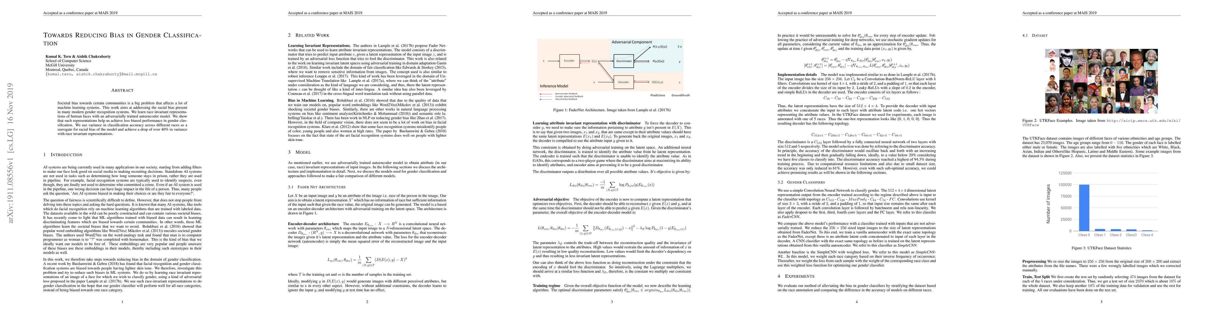 This paper tackles racial bias in gender classification systems by training an adversarially autoencoder to learn race invariant face representations, achieving a 40% reduction in variance in classification accuracy across different races.
