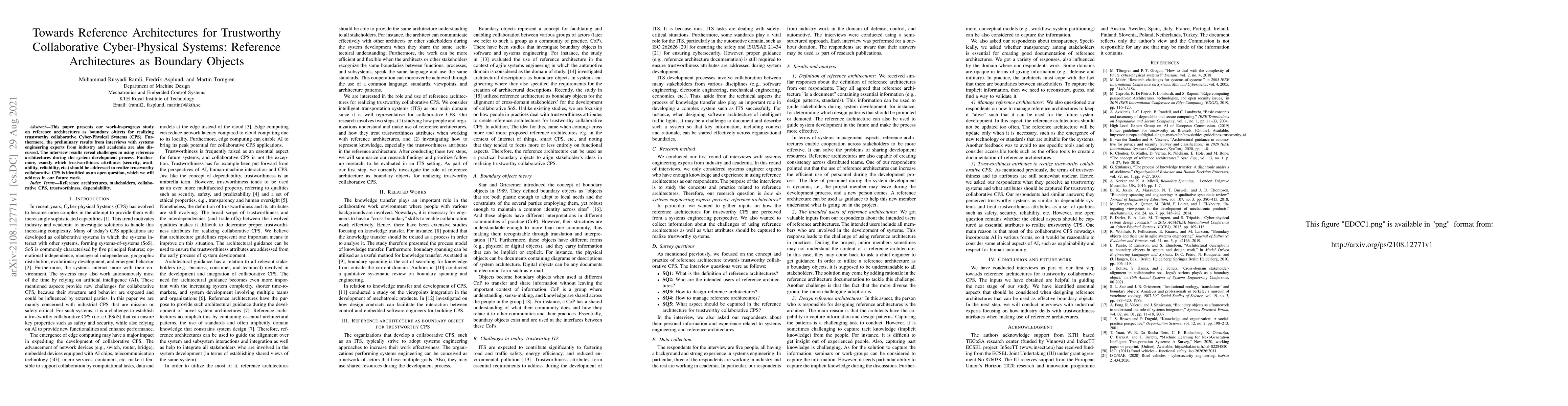 This paper presents our work-in-progress study on reference architectures as boundary objects for realizing trustworthy collaborative Cyber-Physical Systems (CPS). Furthermore, the preliminary results from interviews with systems engineering experts from industry and academia are also discussed. The interview results reveal challenges in using reference architectures during the system development process. Furthermore, exactly which trustworthiness attributes (security, availability, reliability, etc.) should be addressed to realize trustworthy collaborative CPS is identified as an open question, which we will address in our future work.