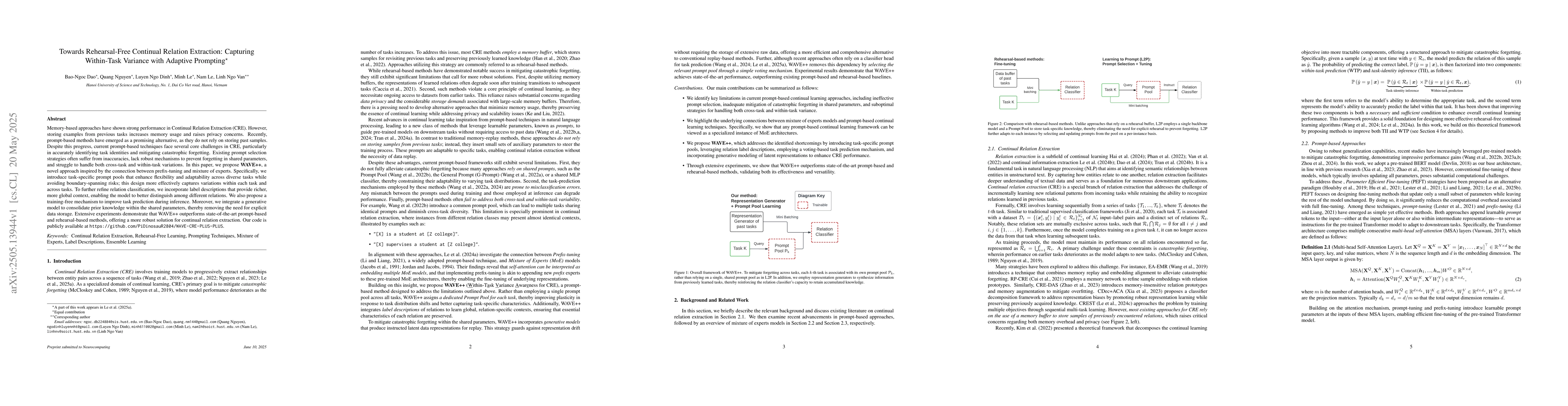 This paper proposes WAVE++ for continual relation extraction, outperforming state-of-the-art methods with its task-specific prompt pools, label descriptions, and training-free mechanism, offering a more robust solution without storing past samples.