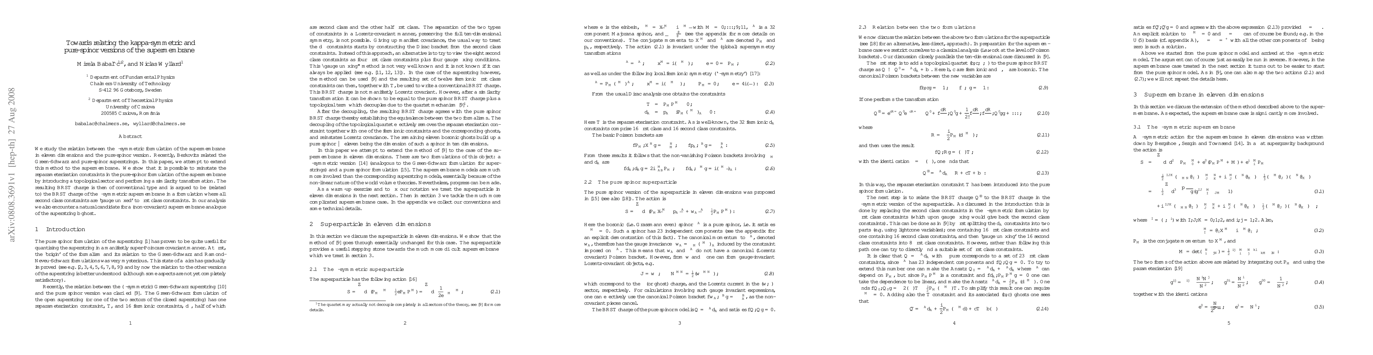 We study the relation between the kappa-symmetric formulation of the supermembrane in eleven dimensions and the pure-spinor version. Recently, Berkovits related the Green-Schwarz and pure-spinor superstrings. In this paper, we attempt to extend this method to the supermembrane. We show that it is possible to reinstate the reparameterisation constraints in the pure-spinor formulation of the supermembrane by introducing a topological sector and performing a similarity transformation. The resulting BRST charge is then of conventional type and is argued to be (related to) the BRST charge of the kappa-symmetric supermembrane in a formulation where all second class constraints are 'gauge unfixed' to first class constraints. In our analysis we also encounter a natural candidate for a (non-covariant) supermembrane analogue of the superstring b ghost.