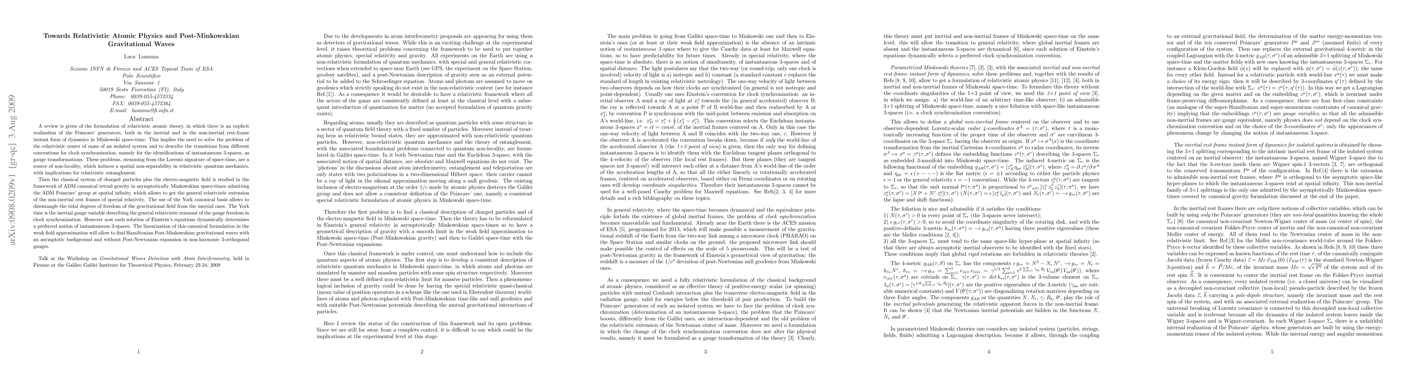 A review is given of the formulation of relativistic atomic theory, in which there is an explicit realization of the Poincare' generators, both in the inertial and in the non-inertial rest-frame instant form of dynamics in Minkowski space-time. This implies the need to solve the problem of the relativistic center of mass of an isolated system and to describe the transitions from different conventions for clock synchronization, namely for the identifications of instantaneous 3-spaces, as gauge transformations. These problems, stemming from the Lorentz signature of space-time, are a source of non-locality, which induces a spatial non-separability in relativistic quantum mechanics, with implications for relativistic entanglement. Then the classical system of charged particles plus the electro-magnetic field is studied in the framework of ADM canonical tetrad gravity in asymptotically Minkowskian space-times admitting the ADM Poincare' group at spatial infinity, which allows to get the general relativistic extension of the non-inertial rest frames of special relativity. The use of the York canonical basis allows to disentangle the tidal degrees of freedom of the gravitational field from the inertial ones. The York time is the inertial gauge variable describing the general relativistic remnant of the gauge freedom in clock synchronization. However now each solution of Einstein's equations dynamically determines a preferred notion of instantaneous 3-spaces. The linearization of this canonical formulation in the weak field approximation will allow to find Hamiltonian Post-Minkowskian gravitational waves with an asymptotic background and without Post-Newtonian expansion in non-harmonic 3-orthogonal gauges.