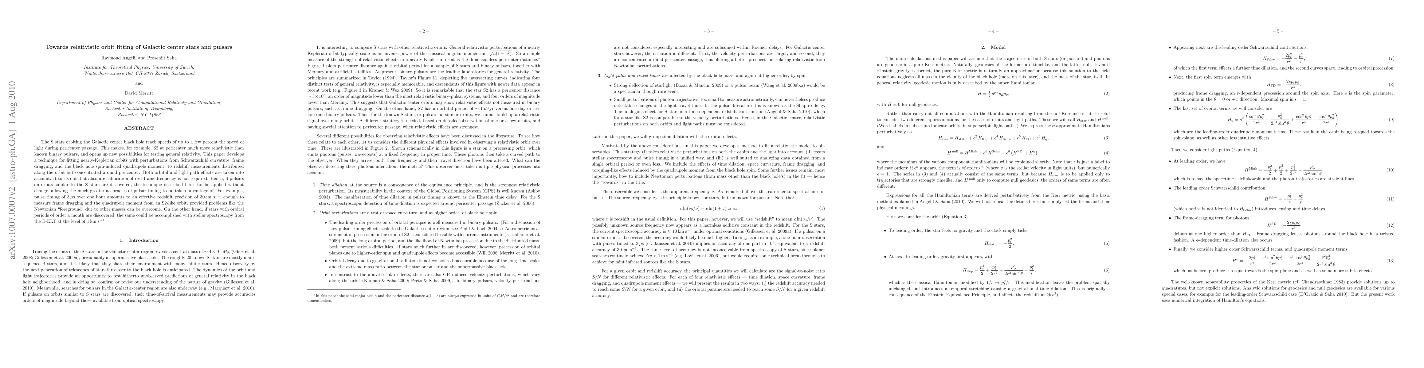 The S stars orbiting the Galactic center black hole reach speeds of up to a few percent the speed of light during pericenter passage. This makes, for example, S2 at pericenter much more relativistic than known binary pulsars, and opens up new possibilities for testing general relativity. This paper develops a technique for fitting nearly-Keplerian orbits with perturbations from Schwarzschild curvature, frame dragging, and spin-induced torque, to redshift measurements distributed along the orbit but concentrated around pericenter. Both orbital and light-path effects are taken into account. It turns out that absolute calibration of rest-frame frequency is not required. Hence, if pulsars on orbits similar to the S stars are discovered, the technique described here can be applied without change, allowing the much greater accuracies of pulsar timing to be taken advantage of. For example, pulse timing of 3 microsec over one hour amounts to an effective redshift precision of 30 cm/s, enough to measure frame dragging and the quadrupole moment from an S2-like orbit, provided problems like the Newtonian "foreground" due to other masses can be overcome. On the other hand, if stars with orbital periods of order a month are discovered, the same could be accomplished with stellar spectroscopy from the E-ELT at the level of 1 km/s.