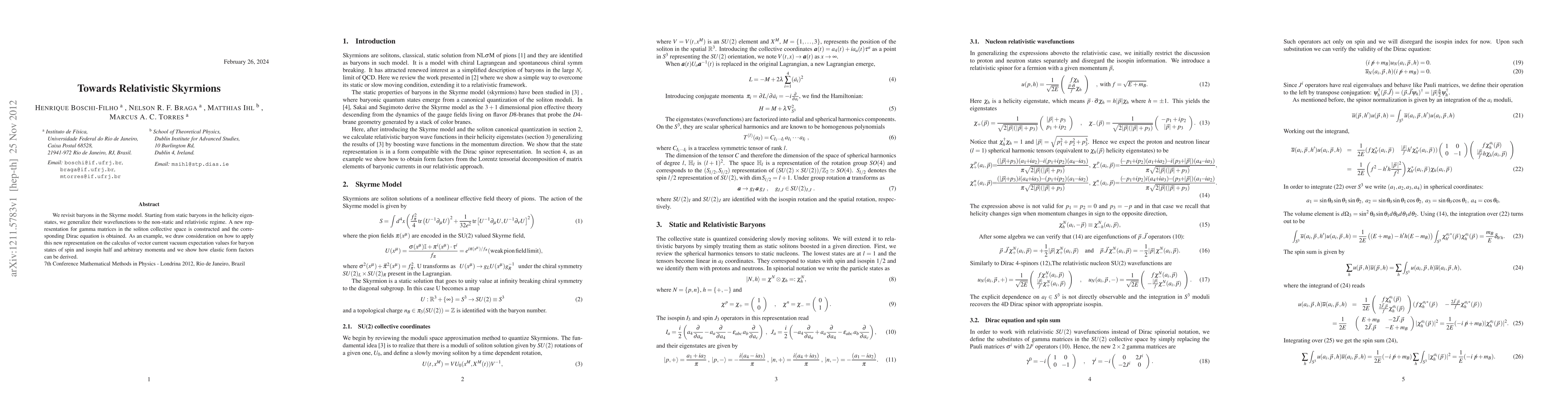 We revisit baryons in the Skyrme model. Starting from static baryons in the helicity eigenstates, we generalize their wavefunctions to the non-static and relativistic regime. A new representation for gamma matrices in the soliton collective space is constructed and the corresponding Dirac equation is obtained. As an example, we draw consideration on how to apply this new representation on the calculus of vector current vacuum expectation values for baryon states of spin and isospin half and arbitrary momenta and we show how elastic form factors can be derived.