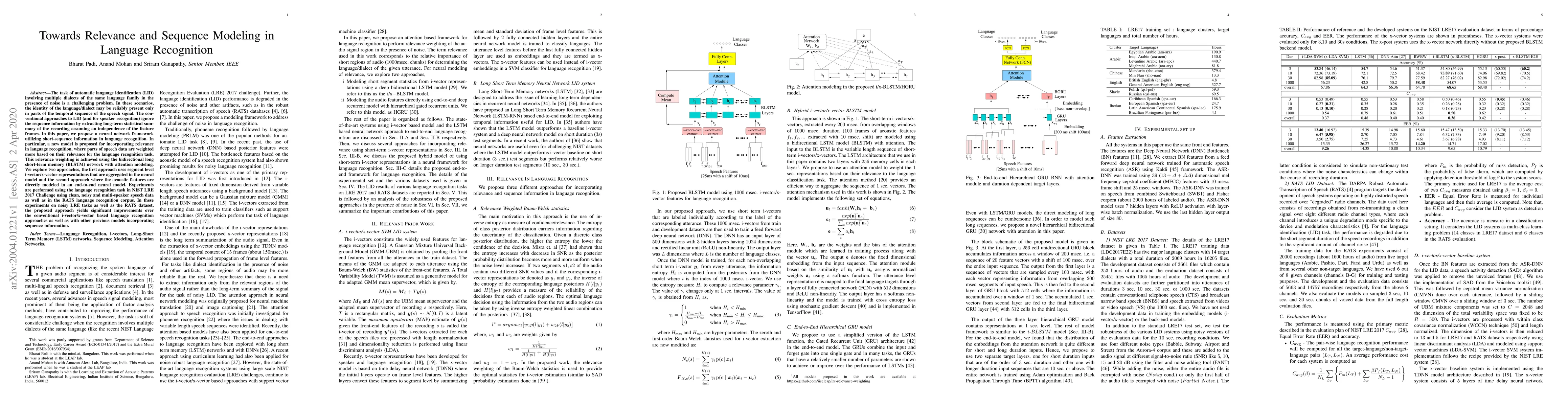 The task of automatic language identification (LID) involving multiple dialects of the same language family in the presence of noise is a challenging problem. In these scenarios, the identity of the language/dialect may be reliably present only in parts of the temporal sequence of the speech signal. The conventional approaches to LID (and for speaker recognition) ignore the sequence information by extracting long-term statistical summary of the recording assuming an independence of the feature frames. In this paper, we propose a neural network framework utilizing short-sequence information in language recognition. In particular, a new model is proposed for incorporating relevance in language recognition, where parts of speech data are weighted more based on their relevance for the language recognition task. This relevance weighting is achieved using the bidirectional long short-term memory (BLSTM) network with attention modeling. We explore two approaches, the first approach uses segment level i-vector/x-vector representations that are aggregated in the neural model and the second approach where the acoustic features are directly modeled in an end-to-end neural model. Experiments are performed using the language recognition task in NIST LRE 2017 Challenge using clean, noisy and multi-speaker speech data as well as in the RATS language recognition corpus. In these experiments on noisy LRE tasks as well as the RATS dataset, the proposed approach yields significant improvements over the conventional i-vector/x-vector based language recognition approaches as well as with other previous models incorporating sequence information.