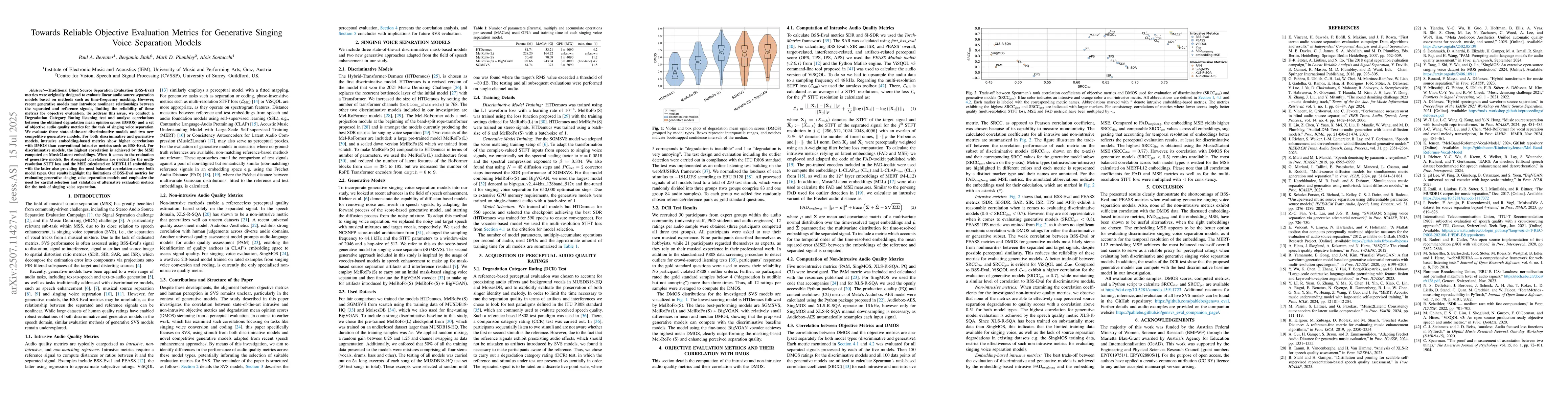 Traditional Blind Source Separation Evaluation (BSS-Eval) metrics were originally designed to evaluate linear audio source separation models based on methods such as time-frequency masking. However, recent generative models may introduce nonlinear relationships between the separated and reference signals, limiting the reliability of these metrics for objective evaluation. To address this issue, we conduct a Degradation Category Rating listening test and analyze correlations between the obtained degradation mean opinion scores (DMOS) and a set of objective audio quality metrics for the task of singing voice separation. We evaluate three state-of-the-art discriminative models and two new competitive generative models. For both discriminative and generative models, intrusive embedding-based metrics show higher correlations with DMOS than conventional intrusive metrics such as BSS-Eval. For discriminative models, the highest correlation is achieved by the MSE computed on Music2Latent embeddings. When it comes to the evaluation of generative models, the strongest correlations are evident for the multi-resolution STFT loss and the MSE calculated on MERT-L12 embeddings, with the latter also providing the most balanced correlation across both model types. Our results highlight the limitations of BSS-Eval metrics for evaluating generative singing voice separation models and emphasize the need for careful selection and validation of alternative evaluation metrics for the task of singing voice separation.