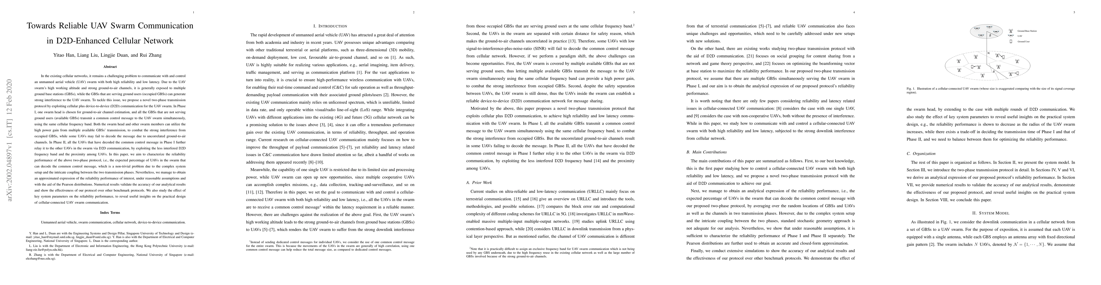 The proposed protocol and its analytical characterization distinguish this work by addressing the unique challenges of UAV swarm communication in cellular networks, offering a practical solution with validated performance improvements.