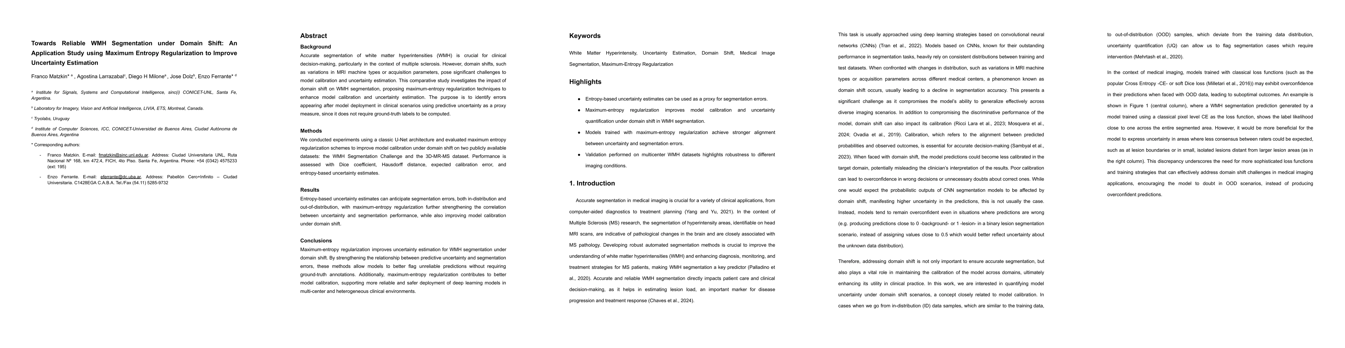 Accurate segmentation of white matter hyperintensities (WMH) is crucial for clinical decision-making, particularly in the context of multiple sclerosis. However, domain shifts, such as variations in MRI machine types or acquisition parameters, pose significant challenges to model calibration and uncertainty estimation. This study investigates the impact of domain shift on WMH segmentation by proposing maximum-entropy regularization techniques to enhance model calibration and uncertainty estimation, with the purpose of identifying errors post-deployment using predictive uncertainty as a proxy measure that does not require ground-truth labels. To do this, we conducted experiments using a U-Net architecture to evaluate these regularization schemes on two publicly available datasets, assessing performance with the Dice coefficient, expected calibration error, and entropy-based uncertainty estimates. Our results show that entropy-based uncertainty estimates can anticipate segmentation errors, and that maximum-entropy regularization further strengthens the correlation between uncertainty and segmentation performance while also improving model calibration under domain shift.