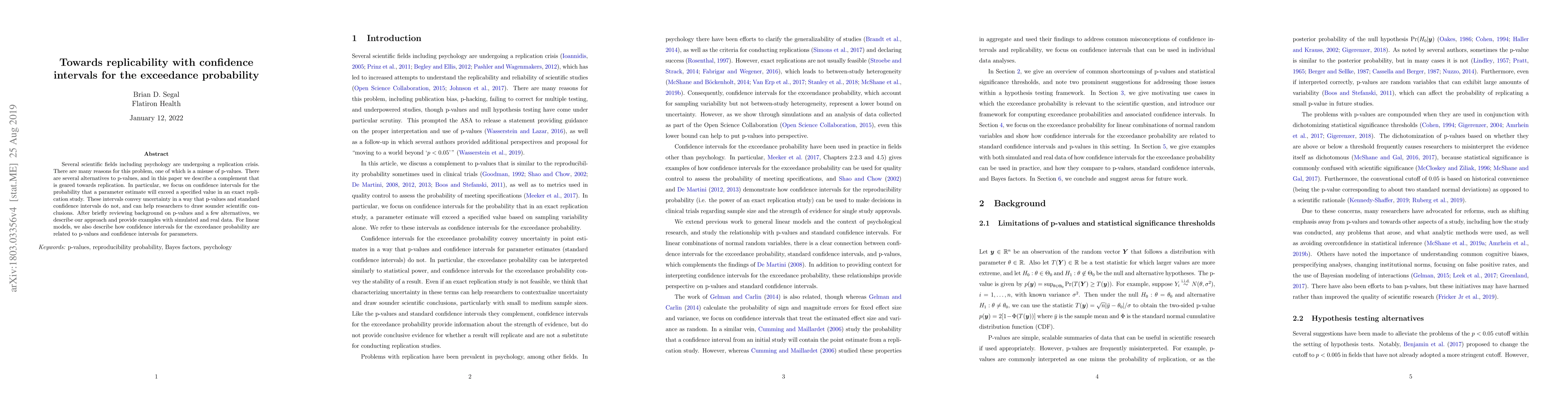 This paper proposes confidence intervals for the exceedance probability as a tool to improve replicability in scientific research, particularly in psychology. It argues that these intervals better convey uncertainty compared to p-values and standard confidence intervals, aiding researchers in drawing more reliable conclusions. The paper provides examples and discusses their relation to p-values and parameter confidence intervals in linear models.