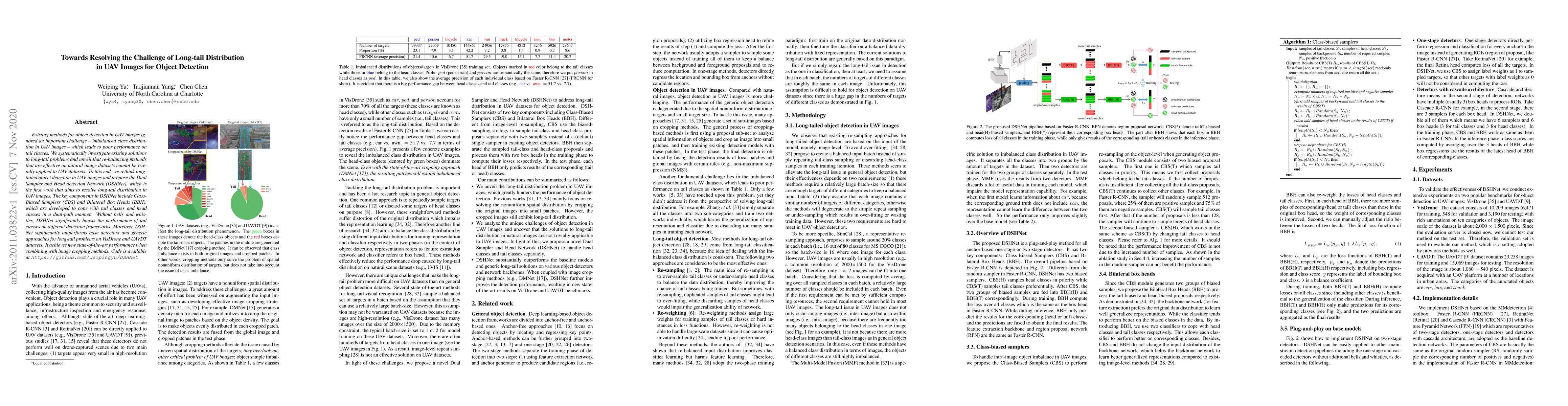 This paper addresses the challenge of long-tail distribution in UAV images for object detection, proposing the Dual Sampler and Head detection Network (DSHNet). DSHNet employs Class-Biased Samplers and Bilateral Box Heads to enhance performance on both tail and head classes, achieving state-of-the-art results on VisDrone and UAVDT datasets.