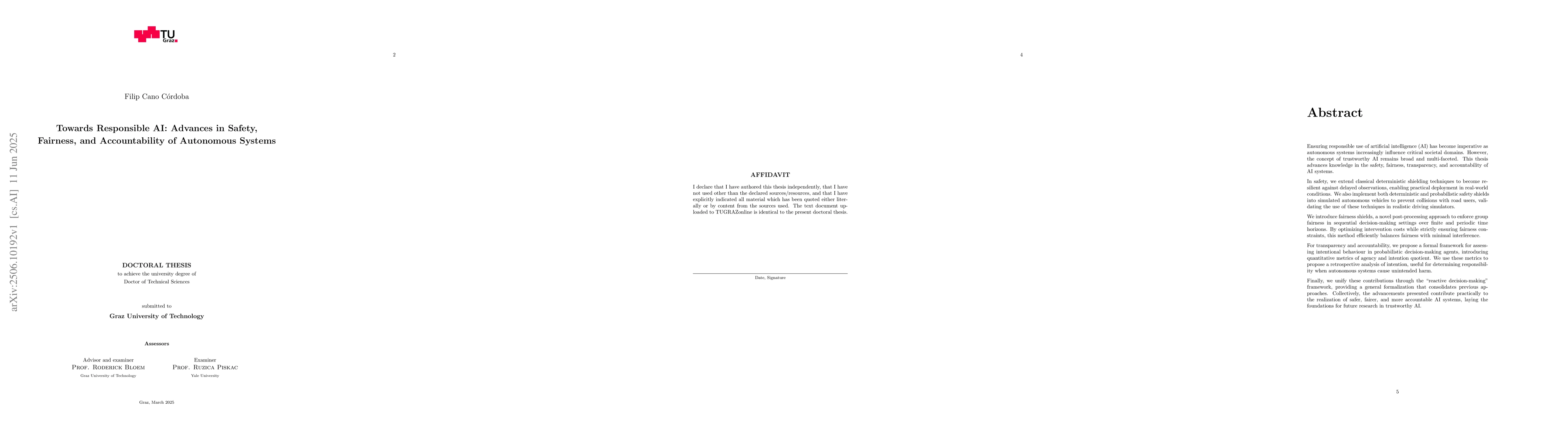 This research paper advances knowledge on making AI systems safer, fairer, and more accountable, with contributions including safety shields for autonomous vehicles and a framework for assessing intentional behavior in decision-making agents.