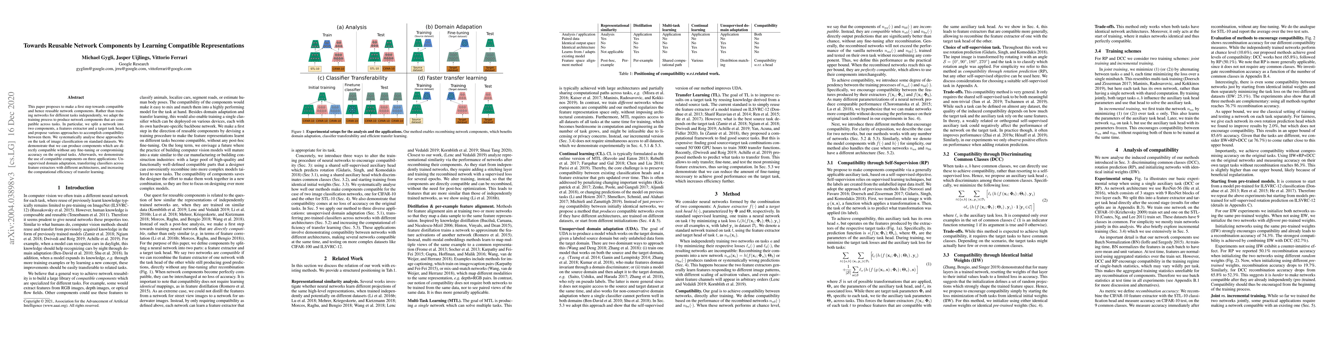 This paper proposes to make a first step towards compatible and hence reusable network components. Rather than training networks for different tasks independently, we adapt the training process to produce network components that are compatible across tasks. In particular, we split a network into two components, a features extractor and a target task head, and propose various approaches to accomplish compatibility between them. We systematically analyse these approaches on the task of image classification on standard datasets. We demonstrate that we can produce components which are directly compatible without any fine-tuning or compromising accuracy on the original tasks. Afterwards, we demonstrate the use of compatible components on three applications: Unsupervised domain adaptation, transferring classifiers across feature extractors with different architectures, and increasing the computational efficiency of transfer learning.