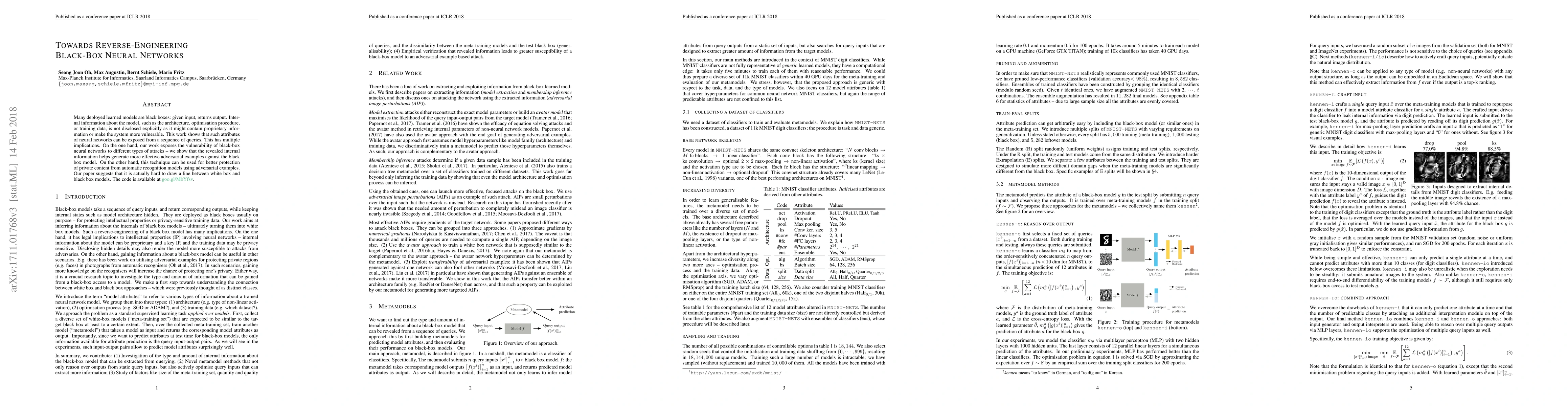 Many deployed learned models are black boxes: given input, returns output. Internal information about the model, such as the architecture, optimisation procedure, or training data, is not disclosed explicitly as it might contain proprietary information or make the system more vulnerable. This work shows that such attributes of neural networks can be exposed from a sequence of queries. This has multiple implications. On the one hand, our work exposes the vulnerability of black-box neural networks to different types of attacks -- we show that the revealed internal information helps generate more effective adversarial examples against the black box model. On the other hand, this technique can be used for better protection of private content from automatic recognition models using adversarial examples. Our paper suggests that it is actually hard to draw a line between white box and black box models.