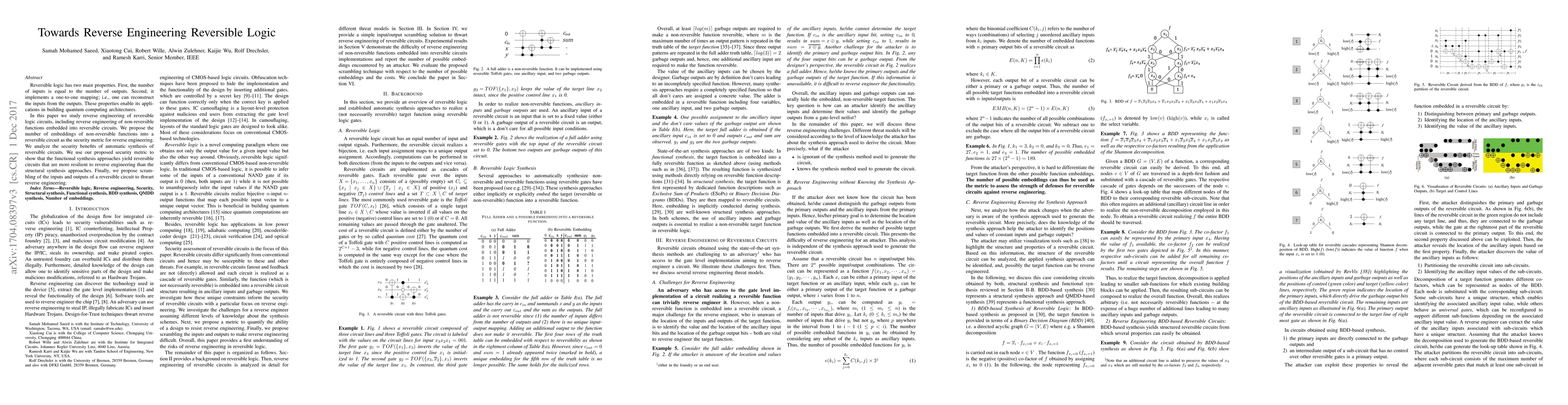 Reversible logic has two main properties. First, the number of inputs is equal to the number of outputs. Second, it implements a one-to-one mapping; i.e., one can reconstruct the inputs from the outputs. These properties enable its applications in building quantum computing architectures. In this paper, we study reverse engineering of reversible logic circuits, including reverse engineering of non-reversible functions embedded into reversible circuits. We propose the number of embeddings of non-reversible functions into a reversible circuit as the security metric for reverse engineering. We analyze the security benefits of automatic synthesis of reversible circuits. We use our proposed security metric to show that the functional synthesis approaches yield reversible circuits that are more resilient to reverse engineering than the structural synthesis approaches. Finally, we propose scrambling of the inputs and outputs of a reversible circuit to thwart reverse engineering.
