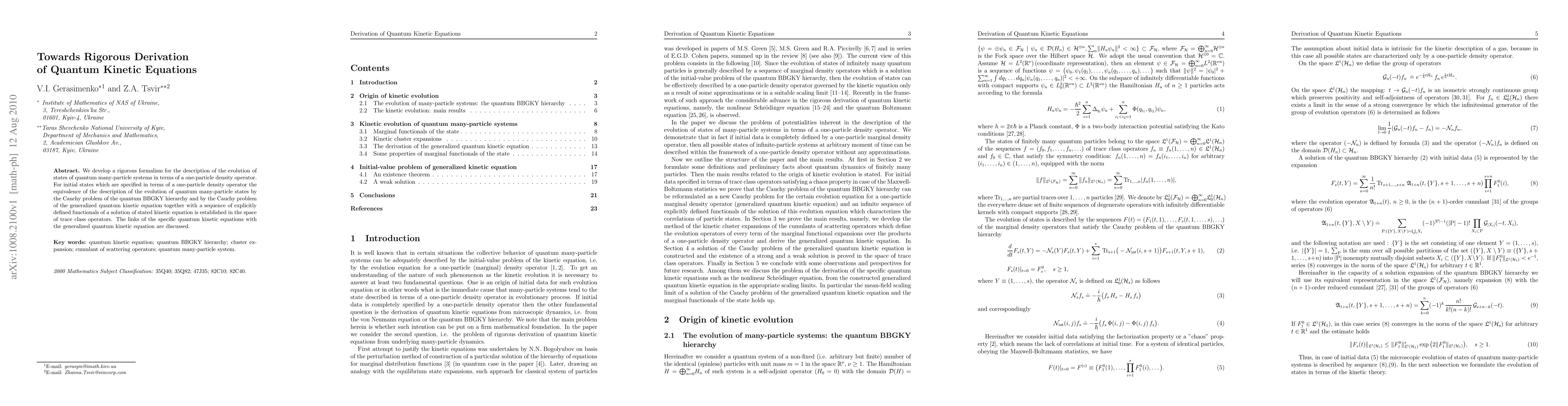 This paper establishes a rigorous formalism for describing the evolution of quantum many-particle systems using a one-particle density operator. It demonstrates the equivalence between the quantum BBGKY hierarchy and a generalized quantum kinetic equation in the space of trace class operators, highlighting their connections.