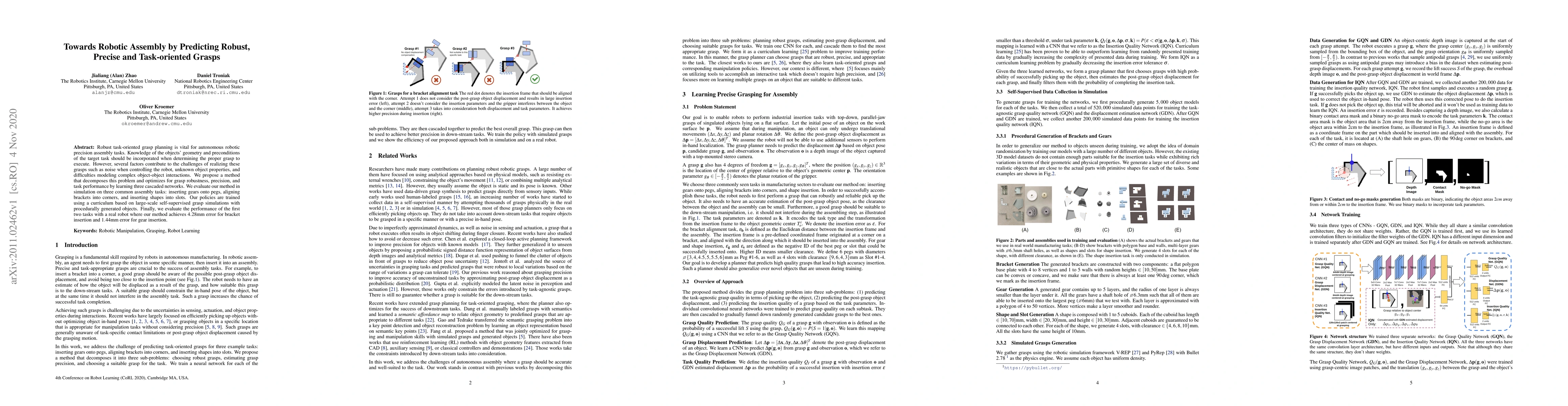 This research introduces a method using three cascaded neural networks to optimize grasp robustness, precision, and task performance for robotic assembly. Evaluated on simulated tasks like gear insertion and bracket alignment, the approach achieved high accuracy, with 1.44mm error for gear insertion and 4.28mm error for bracket insertion, also demonstrating success with a real robot.