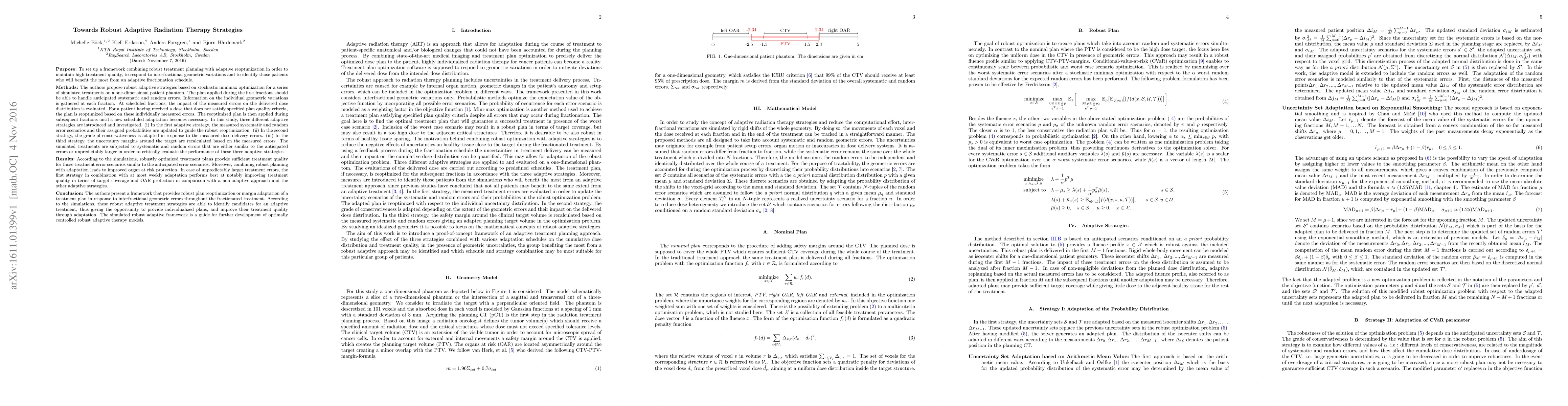 The authors propose robust adaptive strategies based on stochastic minimax optimization for a series of simulated treatments on a one-dimensional patient phantom. The plan applied during the first fractions should be able to handle anticipated systematic and random errors. At scheduled fractions, the impact of the measured errors on the delivered dose distribution is evaluated. For a patient receiving a dose that does not satisfy clinical goals, the plan is reoptimized based on these individually measured errors. The adapted plan is then applied during subsequent fractions until a new scheduled adaptation becomes necessary. In the first adaptive strategy, the measured systematic and random error scenarios and their assigned probabilities are updated to guide the robust reoptimization. In the second strategy, the grade of conservativeness is adapted in response to the measured dose delivery errors. In the third strategy, the uncertainty margins around the target are recalculated based on the measured errors. The simulated systematic and random errors are either similar to the anticipated errors or unpredictably larger, in order to critically evaluate the performance of the adaptive strategies. The simulations show that robustly optimized treatment plans provide sufficient treatment quality for those treatment error scenarios similar to the anticipated error scenarios. Combining robust planning with adaptation leads to improved OAR protection. In case of unpredictably larger treatment errors, the first strategy performs best at improving treatment quality in terms of target coverage and OAR protection. According to the simulations, these robust adaptive treatment strategies are able to identify candidates for an adaptive treatment, thus giving the opportunity to provide individualized plans, and improve their treatment quality through adaptation.