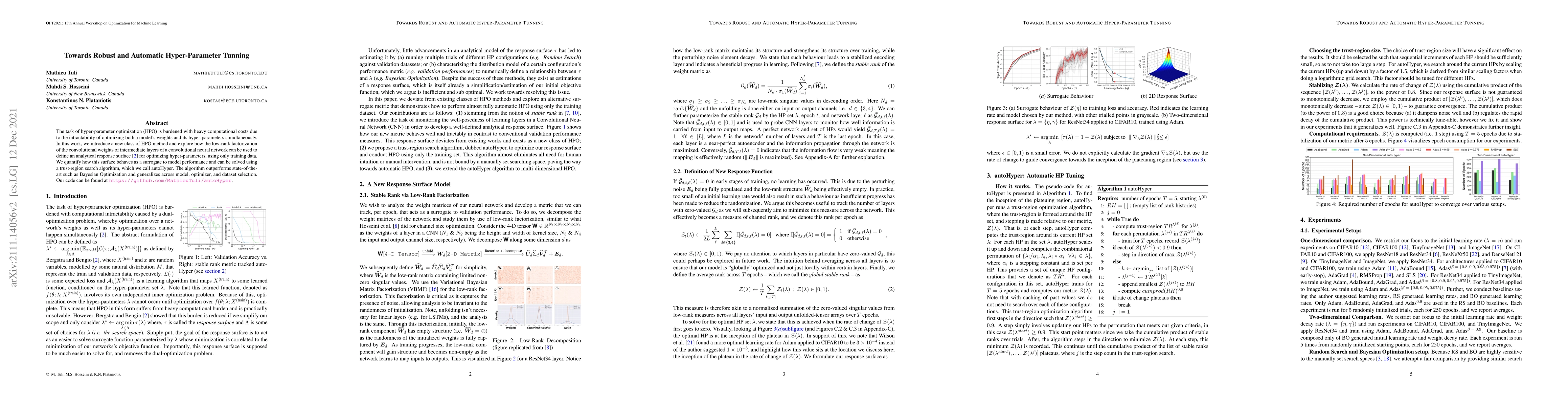 The task of hyper-parameter optimization (HPO) is burdened with heavy computational costs due to the intractability of optimizing both a model's weights and its hyper-parameters simultaneously. In this work, we introduce a new class of HPO method and explore how the low-rank factorization of the convolutional weights of intermediate layers of a convolutional neural network can be used to define an analytical response surface for optimizing hyper-parameters, using only training data. We quantify how this surface behaves as a surrogate to model performance and can be solved using a trust-region search algorithm, which we call autoHyper. The algorithm outperforms state-of-the-art such as Bayesian Optimization and generalizes across model, optimizer, and dataset selection. Our code can be found at \url{https://github.com/MathieuTuli/autoHyper}.