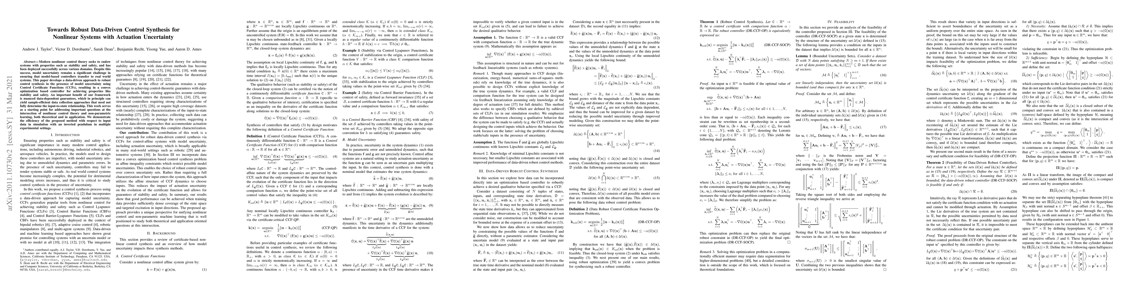 Modern nonlinear control theory seeks to endow systems with properties such as stability and safety, and has been deployed successfully across various domains. Despite this success, model uncertainty remains a significant challenge in ensuring that model-based controllers transfer to real world systems. This paper develops a data-driven approach to robust control synthesis in the presence of model uncertainty using Control Certificate Functions (CCFs), resulting in a convex optimization based controller for achieving properties like stability and safety. An important benefit of our framework is nuanced data-dependent guarantees, which in principle can yield sample-efficient data collection approaches that need not fully determine the input-to-state relationship. This work serves as a starting point for addressing important questions at the intersection of nonlinear control theory and non-parametric learning, both theoretical and in application. We validate the proposed method in simulation with an inverted pendulum in multiple experimental configurations.
