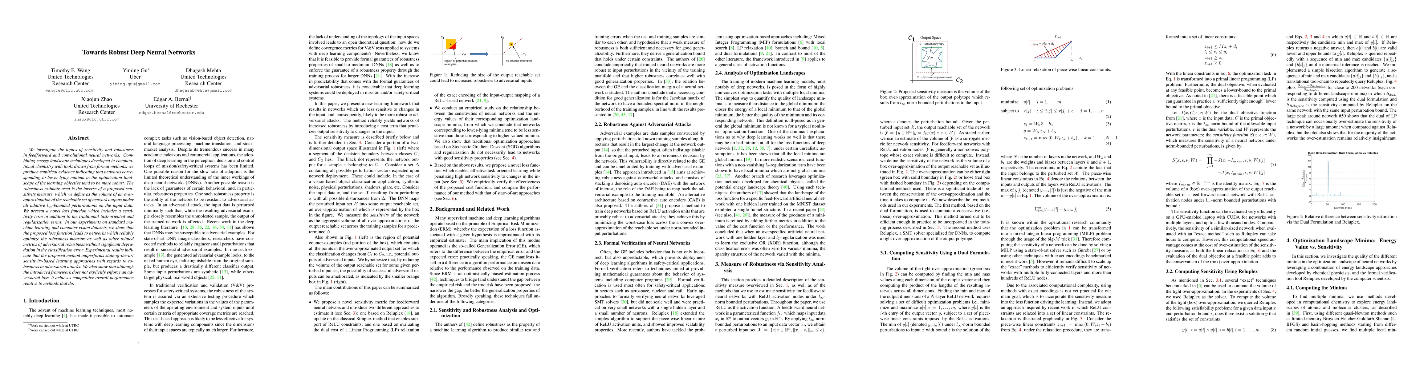 We investigate the topics of sensitivity and robustness in feedforward and convolutional neural networks. Combining energy landscape techniques developed in computational chemistry with tools drawn from formal methods, we produce empirical evidence indicating that networks corresponding to lower-lying minima in the optimization landscape of the learning objective tend to be more robust. The robustness estimate used is the inverse of a proposed sensitivity measure, which we define as the volume of an over-approximation of the reachable set of network outputs under all additive $l_{\infty}$-bounded perturbations on the input data. We present a novel loss function which includes a sensitivity term in addition to the traditional task-oriented and regularization terms. In our experiments on standard machine learning and computer vision datasets, we show that the proposed loss function leads to networks which reliably optimize the robustness measure as well as other related metrics of adversarial robustness without significant degradation in the classification error. Experimental results indicate that the proposed method outperforms state-of-the-art sensitivity-based learning approaches with regards to robustness to adversarial attacks. We also show that although the introduced framework does not explicitly enforce an adversarial loss, it achieves competitive overall performance relative to methods that do.