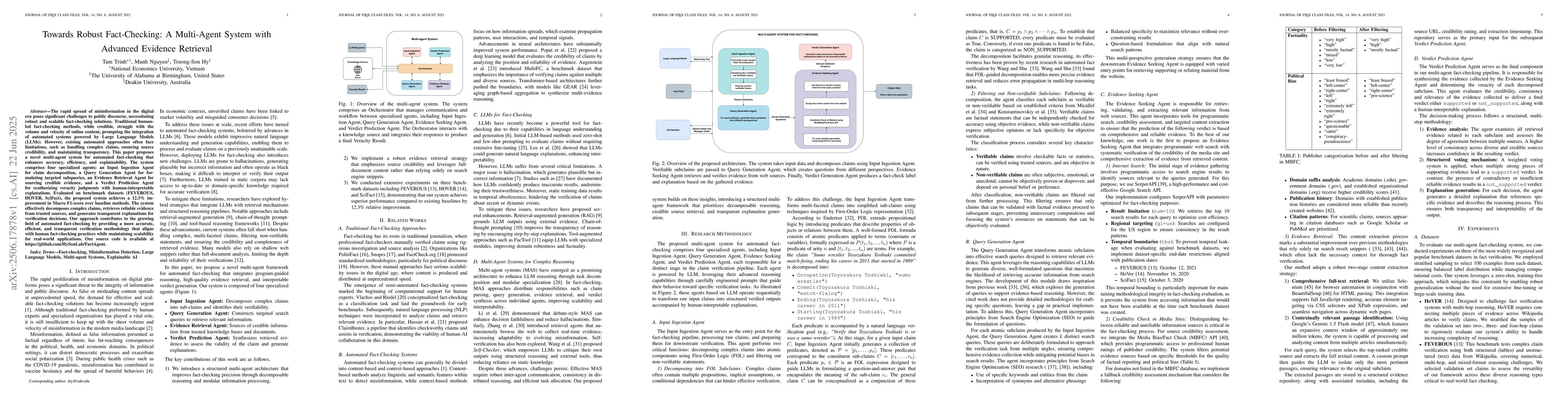 The rapid spread of misinformation in the digital era poses significant challenges to public discourse, necessitating robust and scalable fact-checking solutions. Traditional human-led fact-checking methods, while credible, struggle with the volume and velocity of online content, prompting the integration of automated systems powered by Large Language Models (LLMs). However, existing automated approaches often face limitations, such as handling complex claims, ensuring source credibility, and maintaining transparency. This paper proposes a novel multi-agent system for automated fact-checking that enhances accuracy, efficiency, and explainability. The system comprises four specialized agents: an Input Ingestion Agent for claim decomposition, a Query Generation Agent for formulating targeted subqueries, an Evidence Retrieval Agent for sourcing credible evidence, and a Verdict Prediction Agent for synthesizing veracity judgments with human-interpretable explanations. Evaluated on benchmark datasets (FEVEROUS, HOVER, SciFact), the proposed system achieves a 12.3% improvement in Macro F1-score over baseline methods. The system effectively decomposes complex claims, retrieves reliable evidence from trusted sources, and generates transparent explanations for verification decisions. Our approach contributes to the growing field of automated fact-checking by providing a more accurate, efficient, and transparent verification methodology that aligns with human fact-checking practices while maintaining scalability for real-world applications. Our source code is available at https://github.com/HySonLab/FactAgent