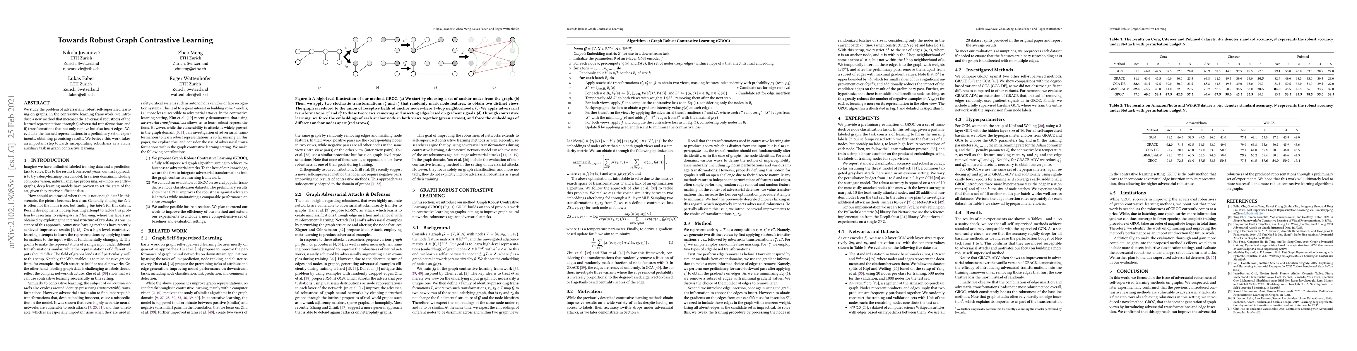 We study the problem of adversarially robust self-supervised learning on graphs. In the contrastive learning framework, we introduce a new method that increases the adversarial robustness of the learned representations through i) adversarial transformations and ii) transformations that not only remove but also insert edges. We evaluate the learned representations in a preliminary set of experiments, obtaining promising results. We believe this work takes an important step towards incorporating robustness as a viable auxiliary task in graph contrastive learning.