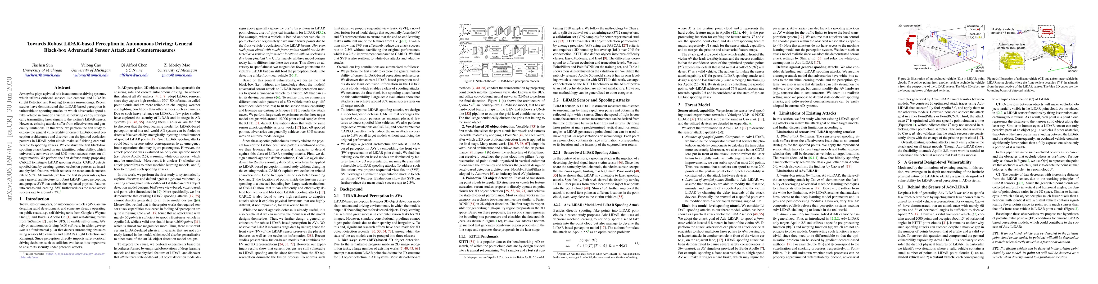 This paper investigates the general vulnerability of LiDAR-based perception in autonomous driving, demonstrating a black-box spoofing attack achieving 80% success across models. It introduces CARLO and SVF defenses that reduce attack success rates to 5.5% and 2.3% respectively by leveraging occlusion patterns and embedding physical features into learning.