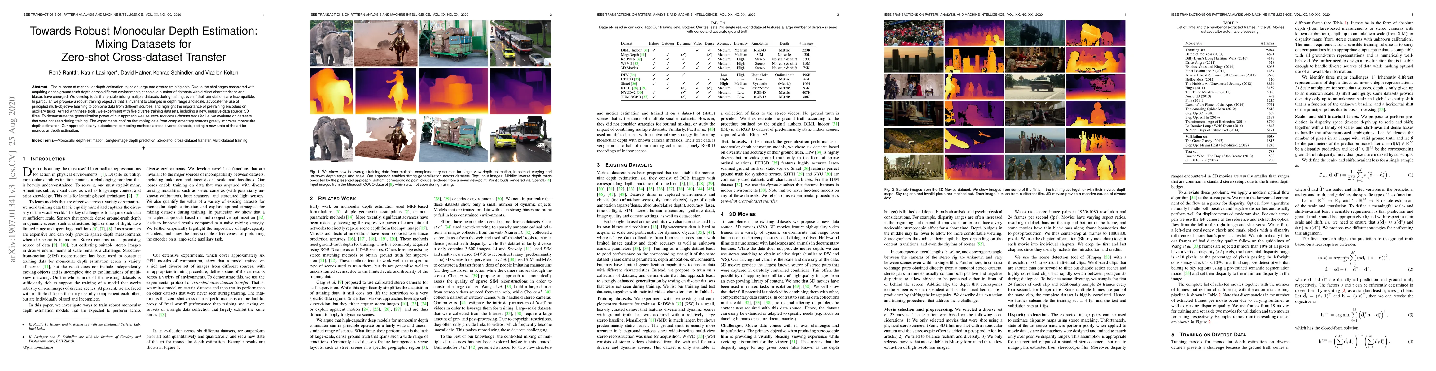 This paper proposes a method for robust monocular depth estimation by mixing multiple diverse training datasets, even those with incompatible annotations. The approach includes a robust training objective, multi-objective learning, and pretraining encoders, which together significantly improve generalization and outperform existing methods across various datasets.