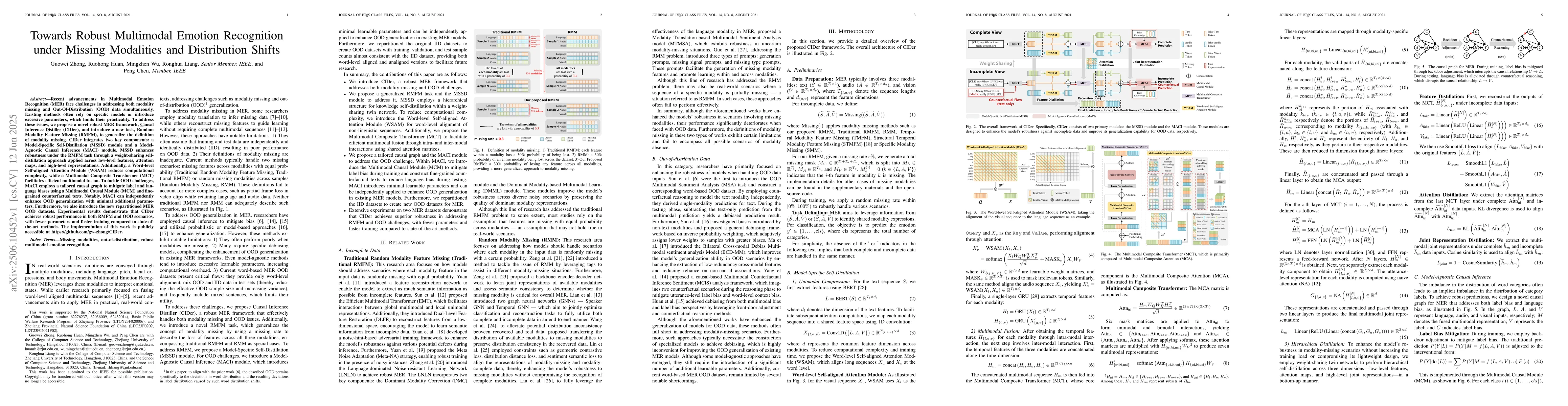 The research introduces Causal Inference Distiller (CIDer), a robust Multimodal Emotion Recognition framework addressing missing modalities and Out-Of-Distribution data simultaneously. CIDer comprises Model-Specific Self-Distillation (MSSD) and Model-Agnostic Causal Inference (MACI) modules, improving robustness under Random Modality Feature Missing tasks and Out-Of-Distribution challenges with minimal extra parameters.