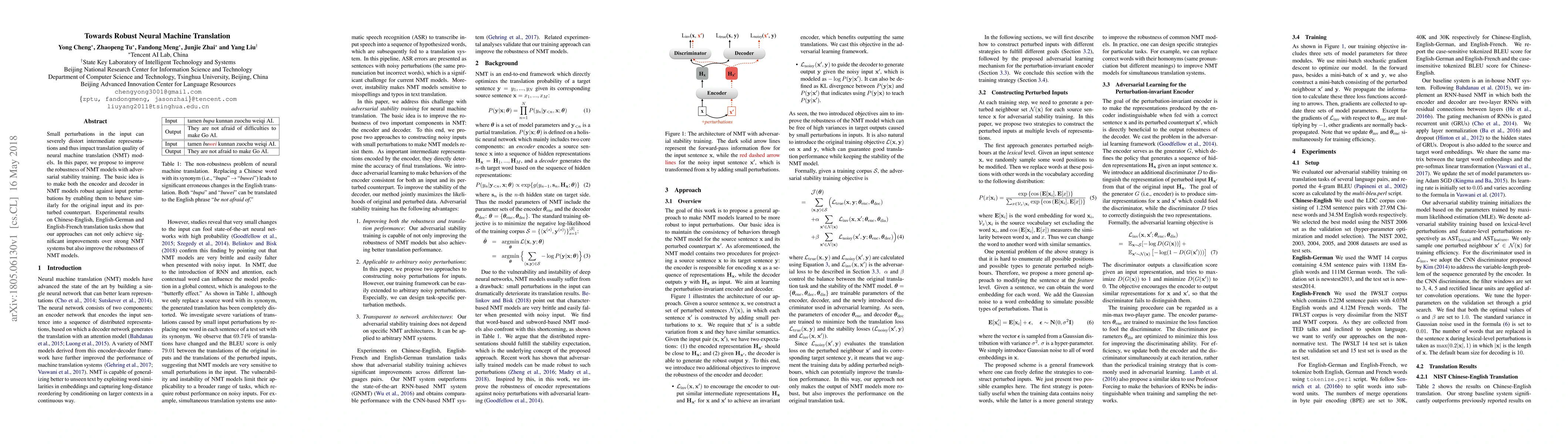 This paper proposes adversarial stability training to enhance the robustness of neural machine translation (NMT) models against input perturbations, achieving significant improvements in translation quality and robustness across multiple language pairs.