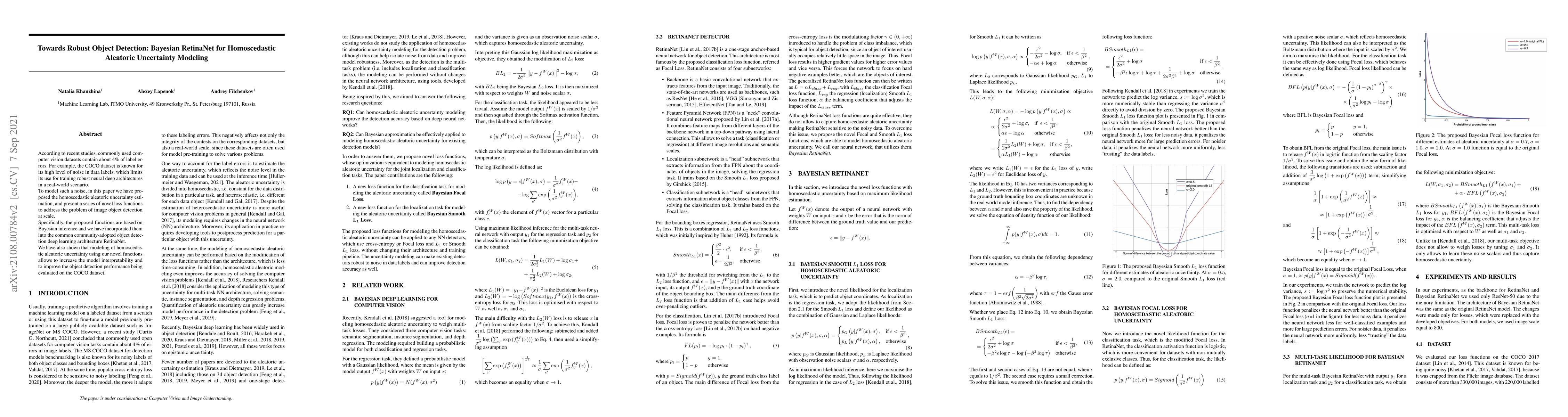 According to recent studies, commonly used computer vision datasets contain about 4% of label errors. For example, the COCO dataset is known for its high level of noise in data labels, which limits its use for training robust neural deep architectures in a real-world scenario. To model such a noise, in this paper we have proposed the homoscedastic aleatoric uncertainty estimation, and present a series of novel loss functions to address the problem of image object detection at scale. Specifically, the proposed functions are based on Bayesian inference and we have incorporated them into the common community-adopted object detection deep learning architecture RetinaNet. We have also shown that modeling of homoscedastic aleatoric uncertainty using our novel functions allows to increase the model interpretability and to improve the object detection performance being evaluated on the COCO dataset.