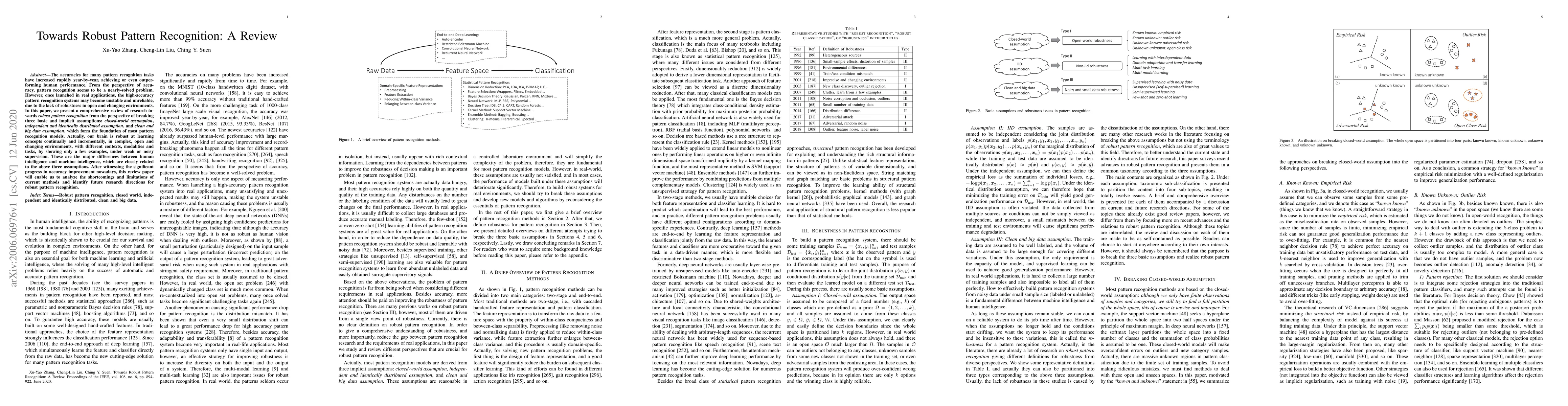 The accuracies for many pattern recognition tasks have increased rapidly year by year, achieving or even outperforming human performance. From the perspective of accuracy, pattern recognition seems to be a nearly-solved problem. However, once launched in real applications, the high-accuracy pattern recognition systems may become unstable and unreliable, due to the lack of robustness in open and changing environments. In this paper, we present a comprehensive review of research towards robust pattern recognition from the perspective of breaking three basic and implicit assumptions: closed-world assumption, independent and identically distributed assumption, and clean and big data assumption, which form the foundation of most pattern recognition models. Actually, our brain is robust at learning concepts continually and incrementally, in complex, open and changing environments, with different contexts, modalities and tasks, by showing only a few examples, under weak or noisy supervision. These are the major differences between human intelligence and machine intelligence, which are closely related to the above three assumptions. After witnessing the significant progress in accuracy improvement nowadays, this review paper will enable us to analyze the shortcomings and limitations of current methods and identify future research directions for robust pattern recognition.