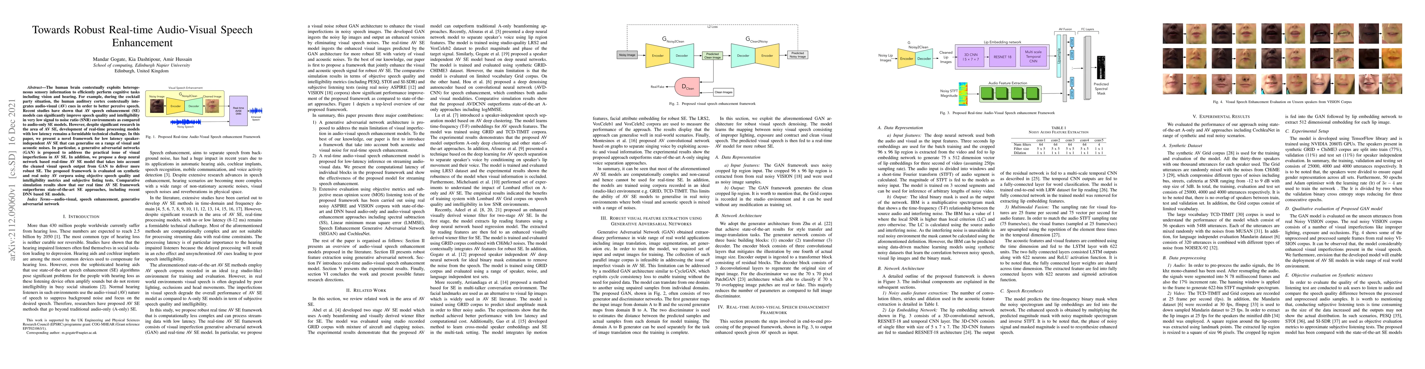This paper introduces a novel real-time audio-visual speech enhancement framework that leverages generative adversarial networks to address visual imperfections and deep neural networks for robust enhancement. The proposed model outperforms existing methods in both objective and subjective evaluations.