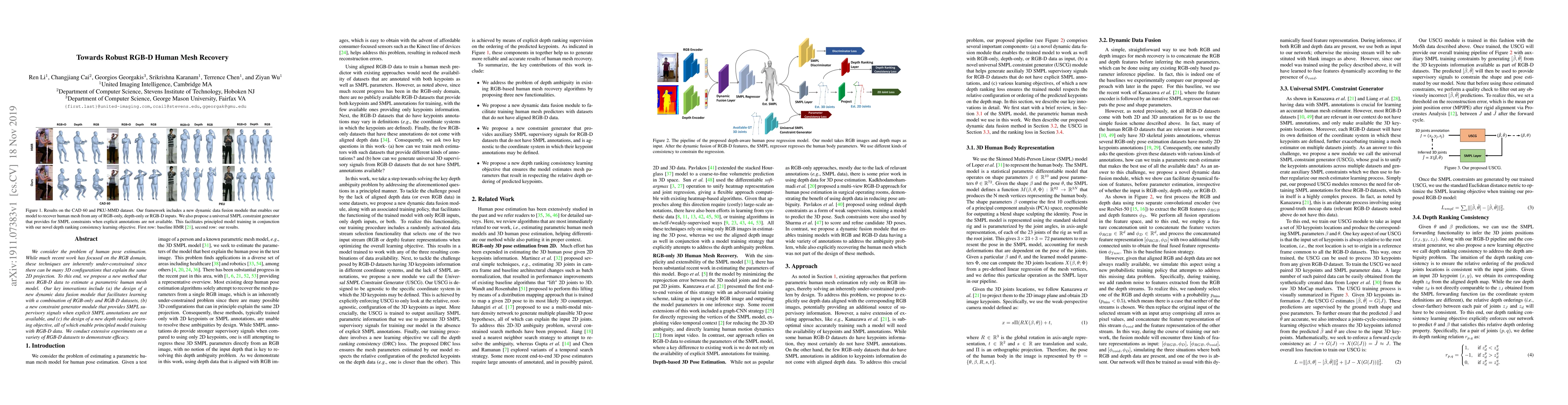 We consider the problem of human pose estimation. While much recent work has focused on the RGB domain, these techniques are inherently under-constrained since there can be many 3D configurations that explain the same 2D projection. To this end, we propose a new method that uses RGB-D data to estimate a parametric human mesh model. Our key innovations include (a) the design of a new dynamic data fusion module that facilitates learning with a combination of RGB-only and RGB-D datasets, (b) a new constraint generator module that provides SMPL supervisory signals when explicit SMPL annotations are not available, and (c) the design of a new depth ranking learning objective, all of which enable principled model training with RGB-D data. We conduct extensive experiments on a variety of RGB-D datasets to demonstrate efficacy.