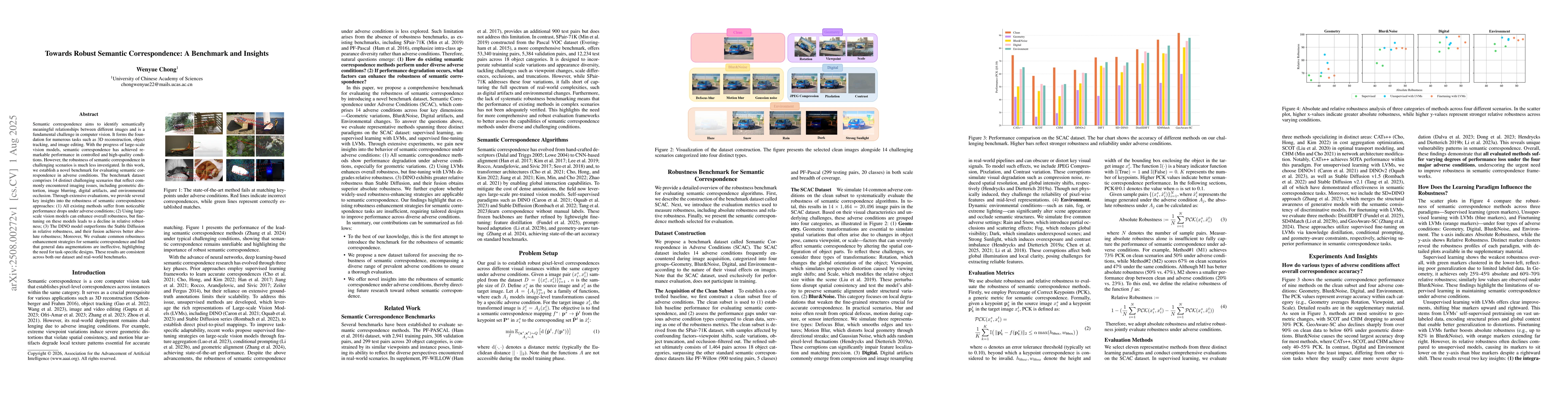 Semantic correspondence aims to identify semantically meaningful relationships between different images and is a fundamental challenge in computer vision. It forms the foundation for numerous tasks such as 3D reconstruction, object tracking, and image editing. With the progress of large-scale vision models, semantic correspondence has achieved remarkable performance in controlled and high-quality conditions. However, the robustness of semantic correspondence in challenging scenarios is much less investigated. In this work, we establish a novel benchmark for evaluating semantic correspondence in adverse conditions. The benchmark dataset comprises 14 distinct challenging scenarios that reflect commonly encountered imaging issues, including geometric distortion, image blurring, digital artifacts, and environmental occlusion. Through extensive evaluations, we provide several key insights into the robustness of semantic correspondence approaches: (1) All existing methods suffer from noticeable performance drops under adverse conditions; (2) Using large-scale vision models can enhance overall robustness, but fine-tuning on these models leads to a decline in relative robustness; (3) The DINO model outperforms the Stable Diffusion in relative robustness, and their fusion achieves better absolute robustness; Moreover, We evaluate common robustness enhancement strategies for semantic correspondence and find that general data augmentations are ineffective, highlighting the need for task-specific designs. These results are consistent across both our dataset and real-world benchmarks.