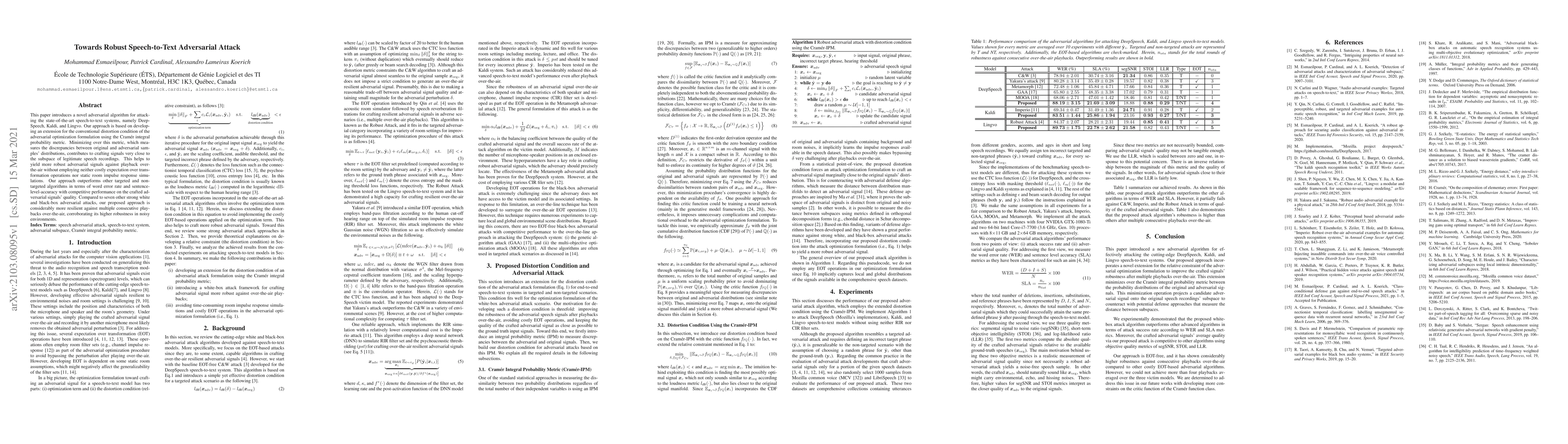 This paper proposes a novel adversarial algorithm to attack state-of-the-art speech-to-text systems using a Cramér integral probability metric, achieving superior robustness and performance compared to existing methods, especially in noisy environments. The approach outperforms other attacks in terms of word error rate and maintains high adversarial signal quality.