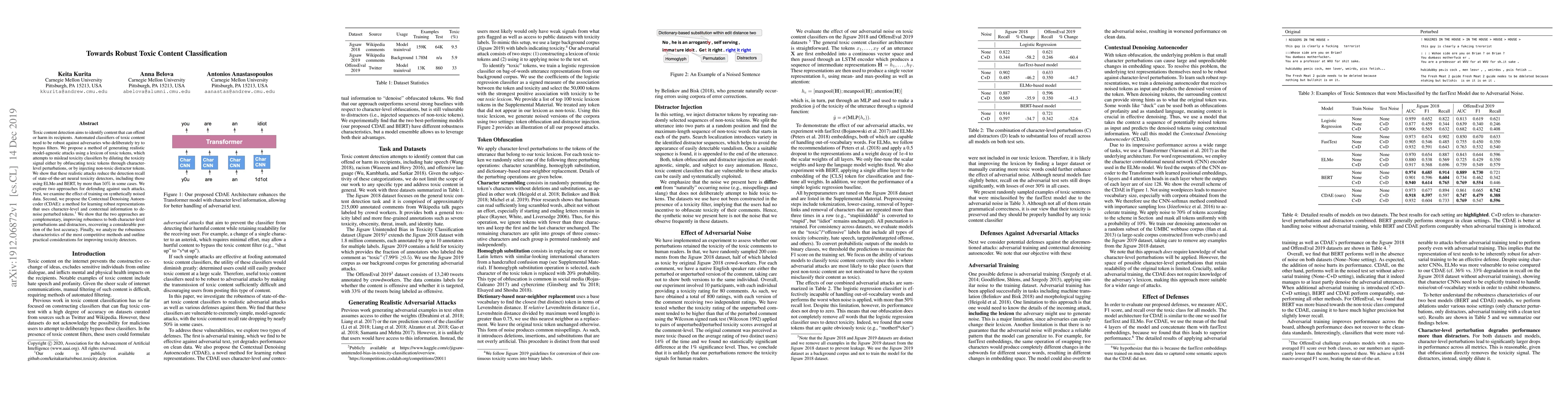 This paper proposes methods to generate realistic attacks against toxic content classifiers and explores defenses against these attacks. It demonstrates that attacks can reduce detection accuracy by over 50%, and introduces two defense strategies, including a Contextual Denoising Autoencoder, which together improve classifier robustness.