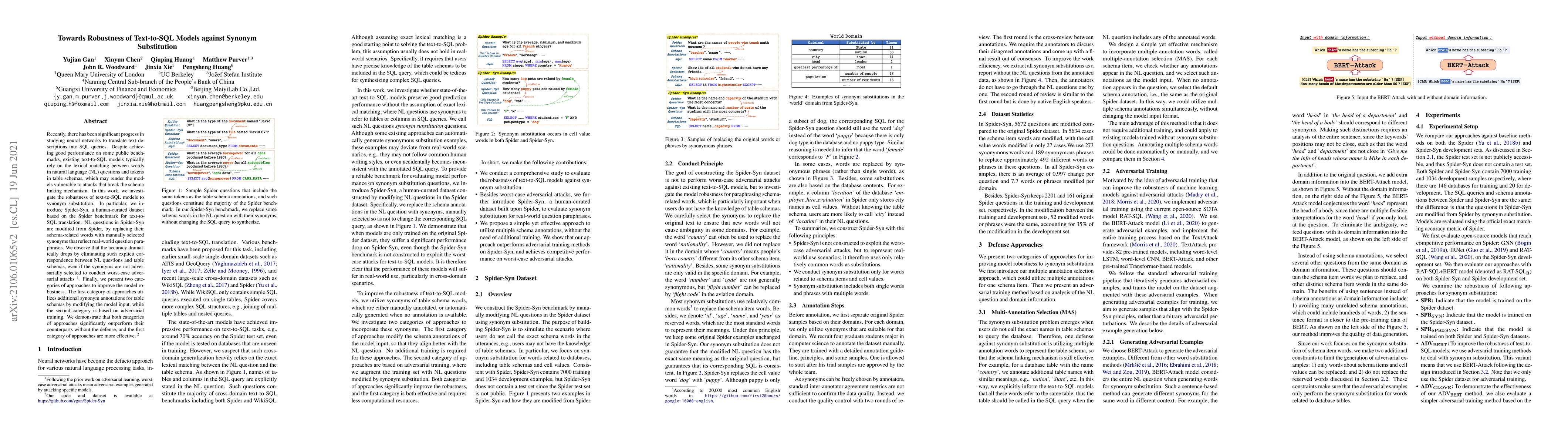 This paper examines the vulnerability of text-to-SQL models to synonym substitutions, introducing Spider-Syn to test this robustness. It finds that synonym replacements significantly reduce model accuracy, and proposes two defense strategies: input modification with synonym annotations and adversarial training, showing improved robustness.