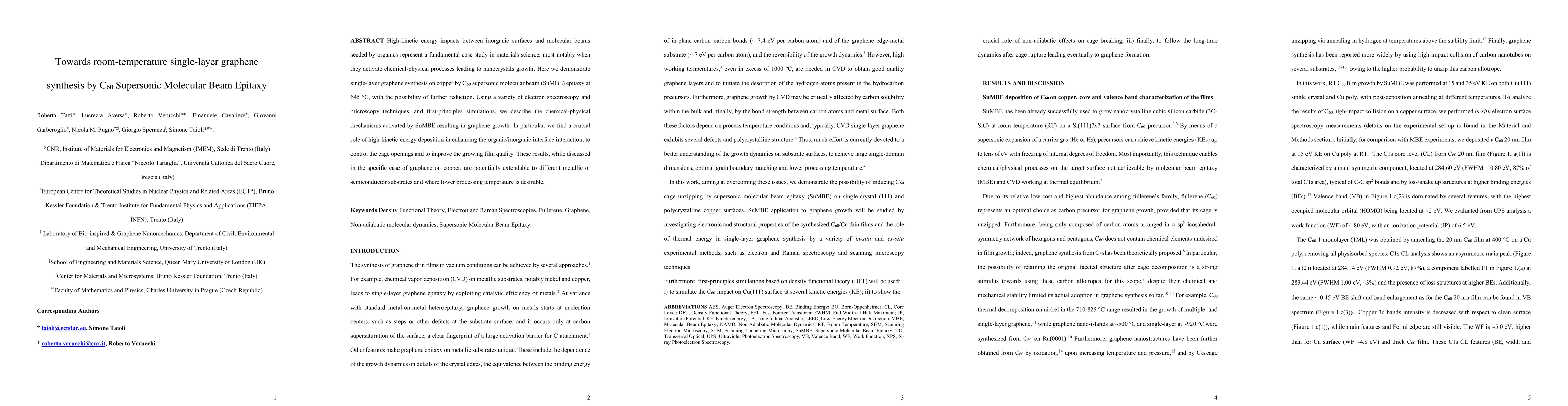 This paper demonstrates the synthesis of single-layer graphene on copper using C60 supersonic molecular beam epitaxy at 645°C. High-kinetic energy impacts enhance the organic/inorganic interface, improving film quality and potentially extending the method to other substrates for lower-temperature processing.