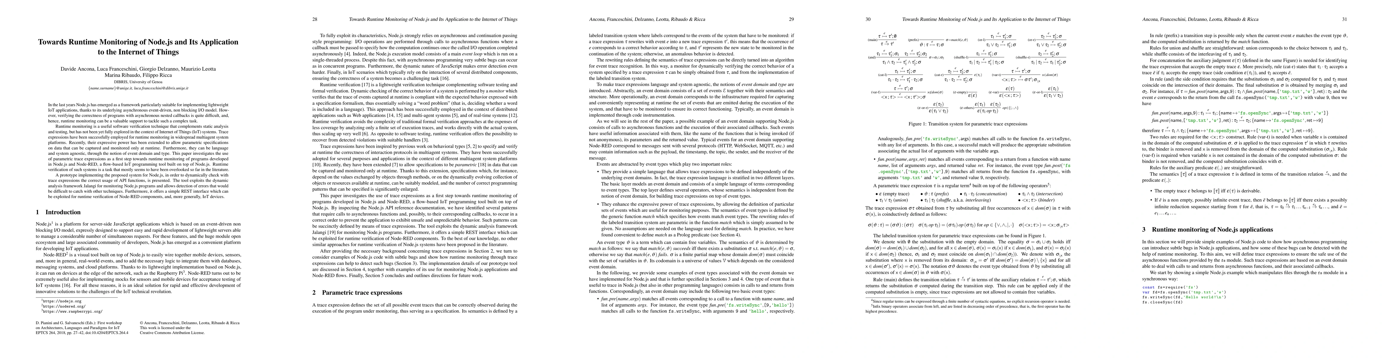 This paper explores runtime monitoring of Node.js applications, particularly for IoT systems, using parametric trace expressions to dynamically verify the correct usage of API functions. A prototype leveraging Jalangi's dynamic analysis framework is presented, enabling detection of errors difficult to catch with traditional methods, and offering a REST interface for IoT device verification.