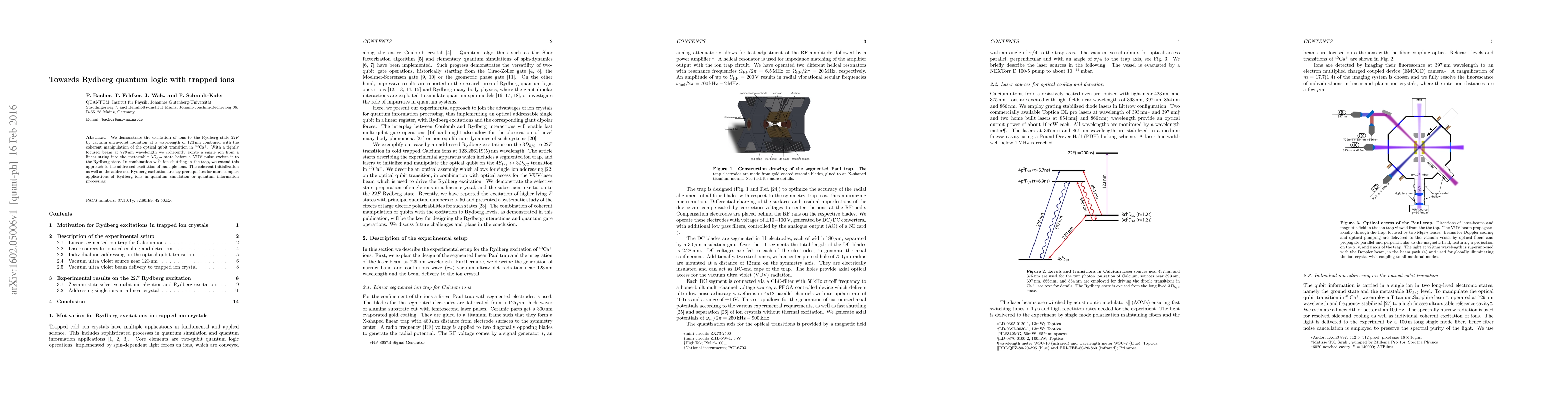 This paper demonstrates the coherent excitation of trapped calcium ions to the Rydberg state using a combination of vacuum ultraviolet and optical radiation, paving the way for advanced quantum logic operations and simulations with Rydberg ions. The method includes precise ion shuttling and manipulation, essential for future quantum information processing applications.