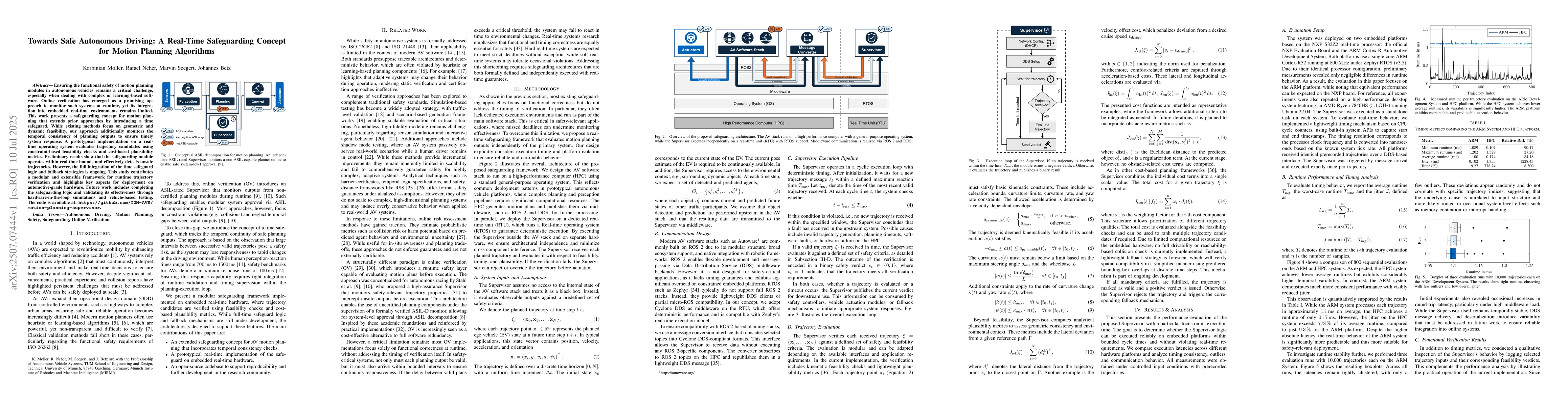 Ensuring the functional safety of motion planning modules in autonomous vehicles remains a critical challenge, especially when dealing with complex or learning-based software. Online verification has emerged as a promising approach to monitor such systems at runtime, yet its integration into embedded real-time environments remains limited. This work presents a safeguarding concept for motion planning that extends prior approaches by introducing a time safeguard. While existing methods focus on geometric and dynamic feasibility, our approach additionally monitors the temporal consistency of planning outputs to ensure timely system response. A prototypical implementation on a real-time operating system evaluates trajectory candidates using constraint-based feasibility checks and cost-based plausibility metrics. Preliminary results show that the safeguarding module operates within real-time bounds and effectively detects unsafe trajectories. However, the full integration of the time safeguard logic and fallback strategies is ongoing. This study contributes a modular and extensible framework for runtime trajectory verification and highlights key aspects for deployment on automotive-grade hardware. Future work includes completing the safeguarding logic and validating its effectiveness through hardware-in-the-loop simulations and vehicle-based testing. The code is available at: https://github.com/TUM-AVS/motion-planning-supervisor