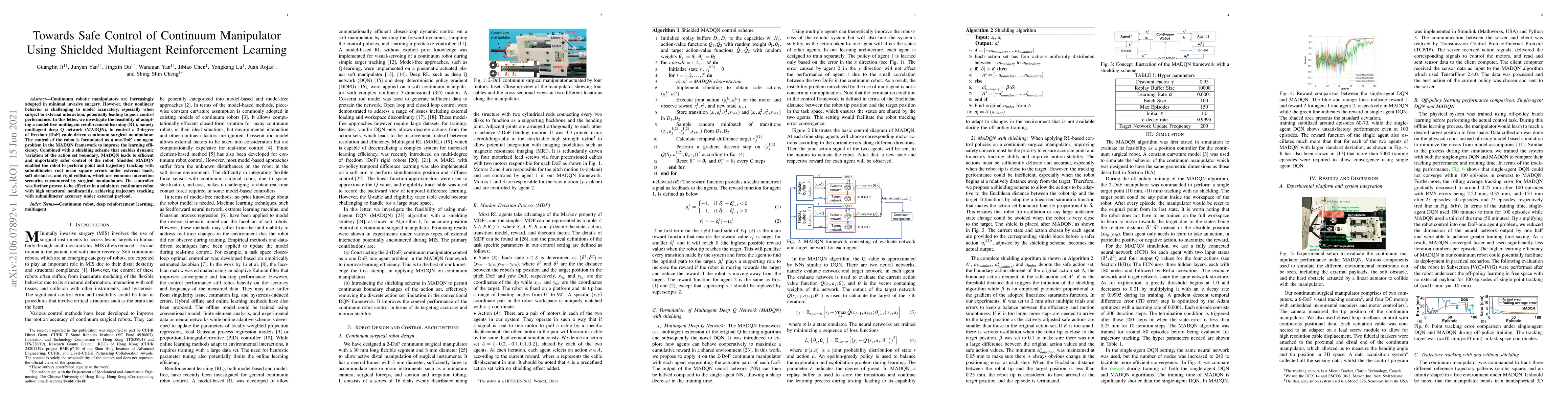 Continuum robotic manipulators are increasingly adopted in minimal invasive surgery. However, their nonlinear behavior is challenging to model accurately, especially when subject to external interaction, potentially leading to poor control performance. In this letter, we investigate the feasibility of adopting a model-free multiagent reinforcement learning (RL), namely multiagent deep Q network (MADQN), to control a 2-degree of freedom (DoF) cable-driven continuum surgical manipulator. The control of the robot is formulated as a one-DoF, one agent problem in the MADQN framework to improve the learning efficiency. Combined with a shielding scheme that enables dynamic variation of the action set boundary, MADQN leads to efficient and importantly safer control of the robot. Shielded MADQN enabled the robot to perform point and trajectory tracking with submillimeter root mean square errors under external loads, soft obstacles, and rigid collision, which are common interaction scenarios encountered by surgical manipulators. The controller was further proven to be effective in a miniature continuum robot with high structural nonlinearitiy, achieving trajectory tracking with submillimeter accuracy under external payload.