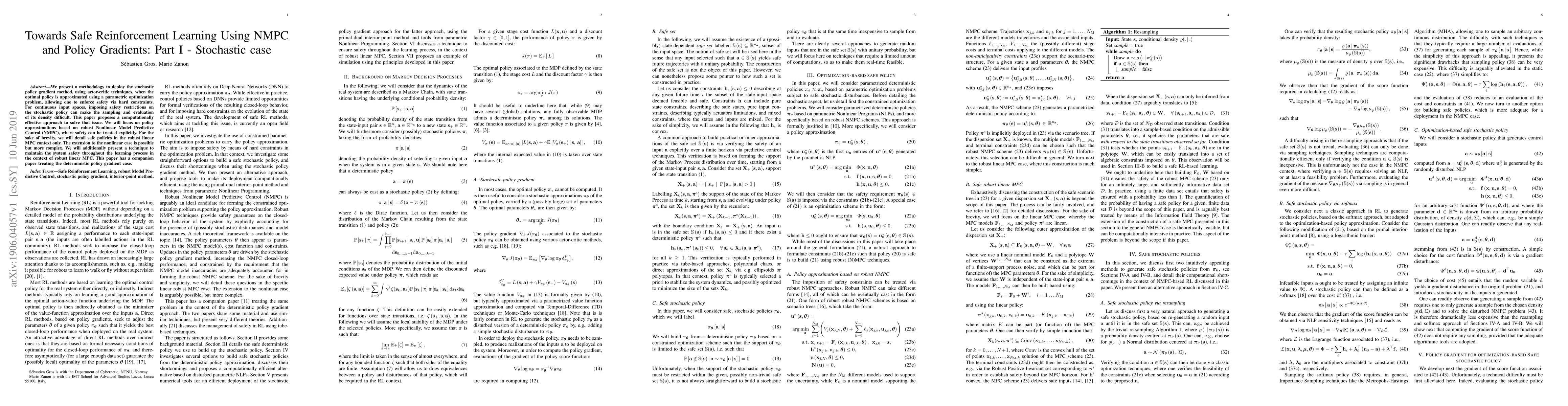 We present a methodology to deploy the stochastic policy gradient method, using actor-critic techniques, when the optimal policy is approximated using a parametric optimization problem, allowing one to enforce safety via hard constraints. For continuous input spaces, imposing safety restrictions on the stochastic policy can make the sampling and evaluation of its density difficult. This paper proposes a computationally effective approach to solve that issue. We will focus on policy approximations based on robust Nonlinear Model Predictive Control (NMPC), where safety can be treated explicitly. For the sake of brevity, we will detail safe policies in the robust linear MPC context only. The extension to the nonlinear case is possible but more complex. We will additionally present a technique to maintain the system safety throughout the learning process in the context of robust linear MPC. This paper has a companion paper treating the deterministic policy gradient case.