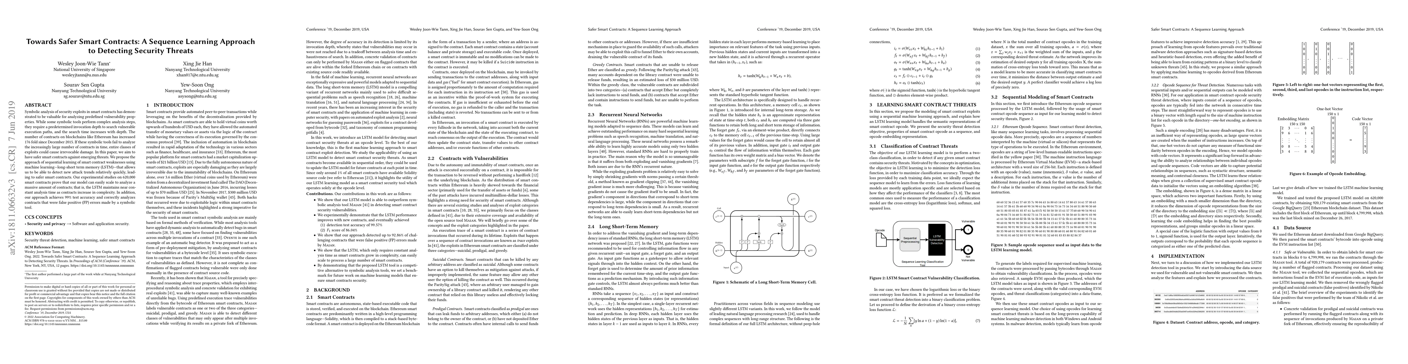 This paper proposes a machine learning-based approach using LSTM to detect security threats in smart contracts, aiming to address the scalability issues of traditional symbolic analysis. Experimental results show that the LSTM model can efficiently analyze large numbers of contracts with near-constant analysis time and achieves 99% test accuracy.