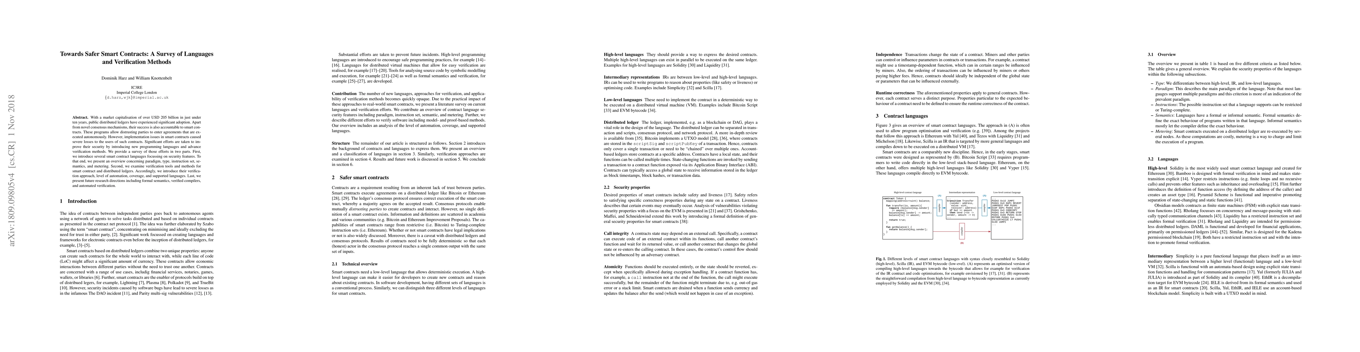 With a market capitalisation of over USD 205 billion in just under ten years, public distributed ledgers have experienced significant adoption. Apart from novel consensus mechanisms, their success is also accountable to smart contracts. These programs allow distrusting parties to enter agreements that are executed autonomously. However, implementation issues in smart contracts caused severe losses to the users of such contracts. Significant efforts are taken to improve their security by introducing new programming languages and advance verification methods. We provide a survey of those efforts in two parts. First, we introduce several smart contract languages focussing on security features. To that end, we present an overview concerning paradigm, type, instruction set, semantics, and metering. Second, we examine verification tools and methods for smart contract and distributed ledgers. Accordingly, we introduce their verification approach, level of automation, coverage, and supported languages. Last, we present future research directions including formal semantics, verified compilers, and automated verification.