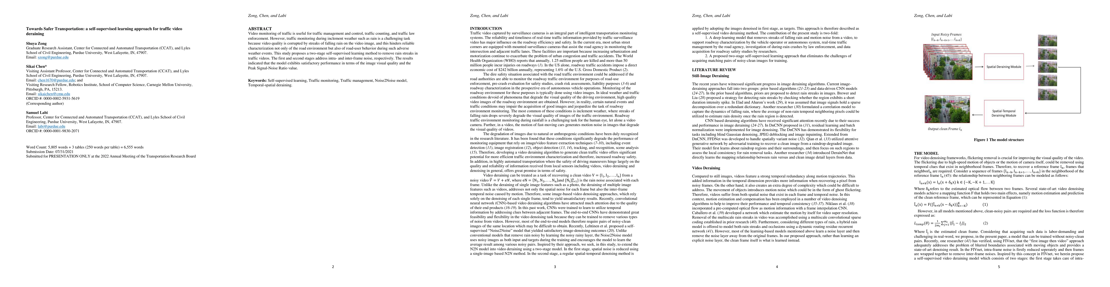 Video monitoring of traffic is useful for traffic management and control, traffic counting, and traffic law enforcement. However, traffic monitoring during inclement weather such as rain is a challenging task because video quality is corrupted by streaks of falling rain on the video image, and this hinders reliable characterization not only of the road environment but also of road-user behavior during such adverse weather events. This study proposes a two-stage self-supervised learning method to remove rain streaks in traffic videos. The first and second stages address intra- and inter-frame noise, respectively. The results indicated that the model exhibits satisfactory performance in terms of the image visual quality and the Peak Signal-Noise Ratio value.