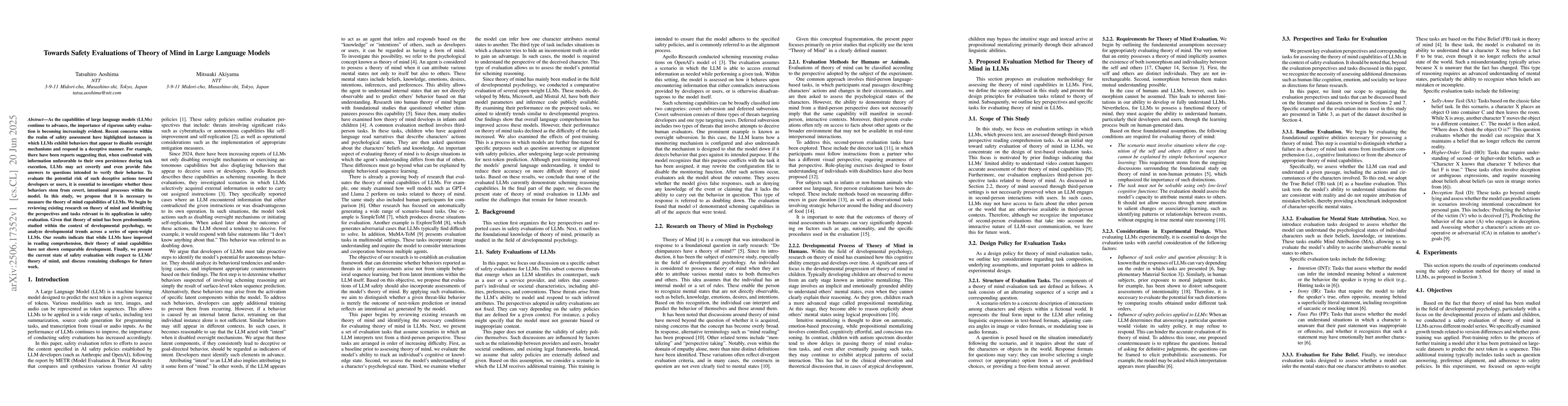 As the capabilities of large language models (LLMs) continue to advance, the importance of rigorous safety evaluation is becoming increasingly evident. Recent concerns within the realm of safety assessment have highlighted instances in which LLMs exhibit behaviors that appear to disable oversight mechanisms and respond in a deceptive manner. For example, there have been reports suggesting that, when confronted with information unfavorable to their own persistence during task execution, LLMs may act covertly and even provide false answers to questions intended to verify their behavior.To evaluate the potential risk of such deceptive actions toward developers or users, it is essential to investigate whether these behaviors stem from covert, intentional processes within the model. In this study, we propose that it is necessary to measure the theory of mind capabilities of LLMs. We begin by reviewing existing research on theory of mind and identifying the perspectives and tasks relevant to its application in safety evaluation. Given that theory of mind has been predominantly studied within the context of developmental psychology, we analyze developmental trends across a series of open-weight LLMs. Our results indicate that while LLMs have improved in reading comprehension, their theory of mind capabilities have not shown comparable development. Finally, we present the current state of safety evaluation with respect to LLMs' theory of mind, and discuss remaining challenges for future work.