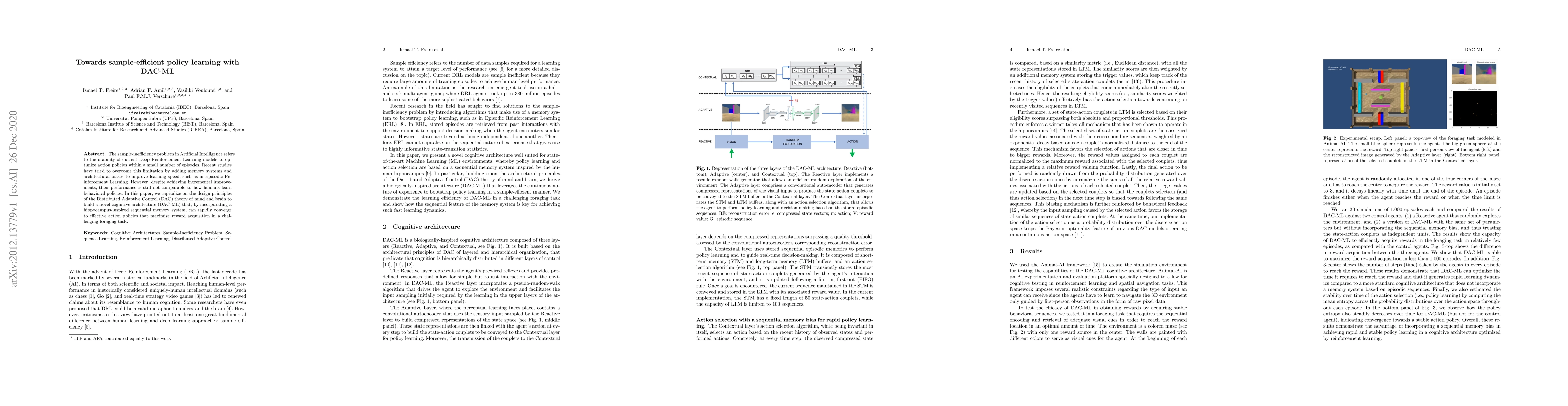 The sample-inefficiency problem in Artificial Intelligence refers to the inability of current Deep Reinforcement Learning models to optimize action policies within a small number of episodes. Recent studies have tried to overcome this limitation by adding memory systems and architectural biases to improve learning speed, such as in Episodic Reinforcement Learning. However, despite achieving incremental improvements, their performance is still not comparable to how humans learn behavioral policies. In this paper, we capitalize on the design principles of the Distributed Adaptive Control (DAC) theory of mind and brain to build a novel cognitive architecture (DAC-ML) that, by incorporating a hippocampus-inspired sequential memory system, can rapidly converge to effective action policies that maximize reward acquisition in a challenging foraging task.