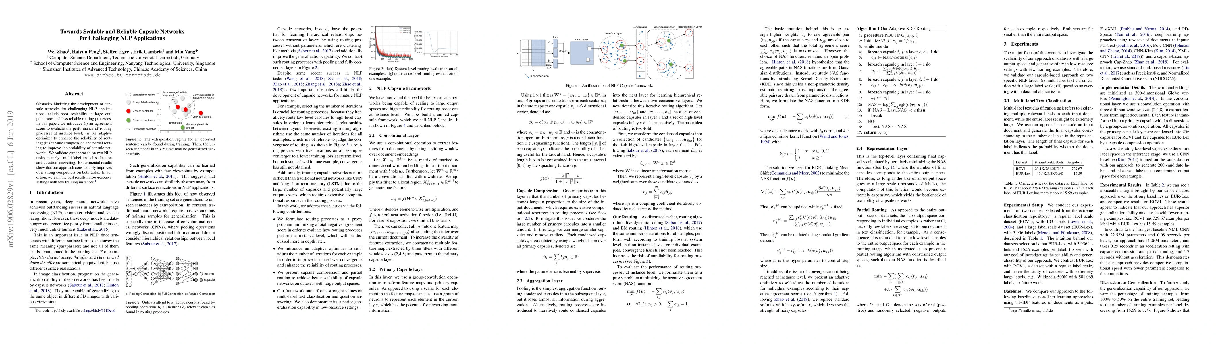 Obstacles hindering the development of capsule networks for challenging NLP applications include poor scalability to large output spaces and less reliable routing processes. In this paper, we introduce: 1) an agreement score to evaluate the performance of routing processes at instance level; 2) an adaptive optimizer to enhance the reliability of routing; 3) capsule compression and partial routing to improve the scalability of capsule networks. We validate our approach on two NLP tasks, namely: multi-label text classification and question answering. Experimental results show that our approach considerably improves over strong competitors on both tasks. In addition, we gain the best results in low-resource settings with few training instances.